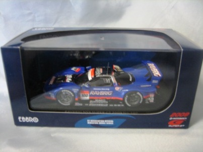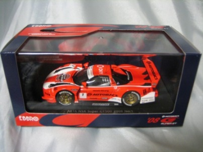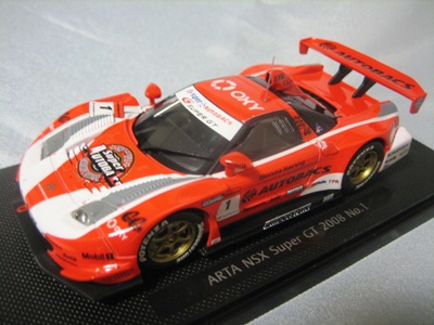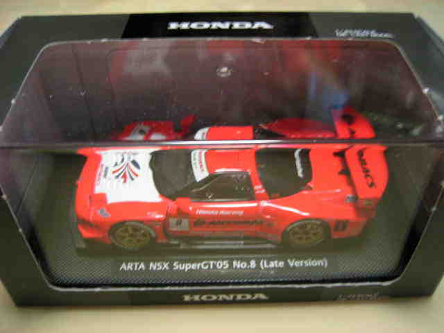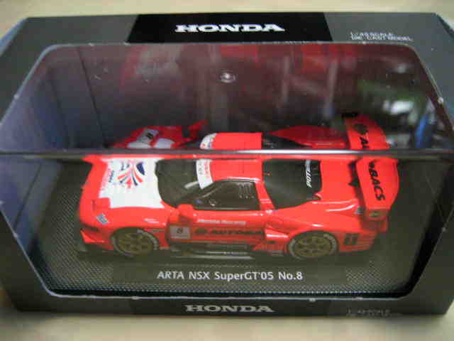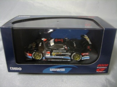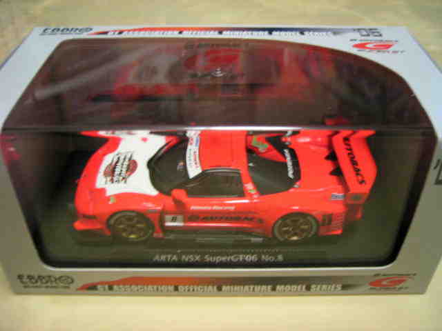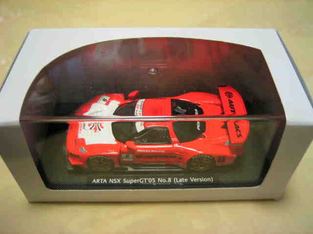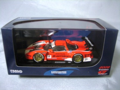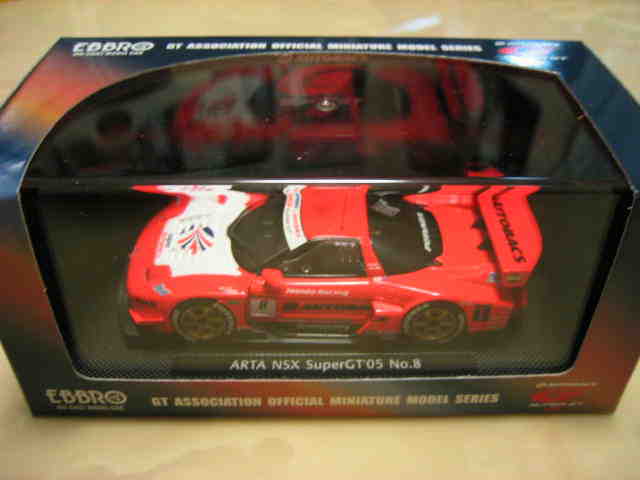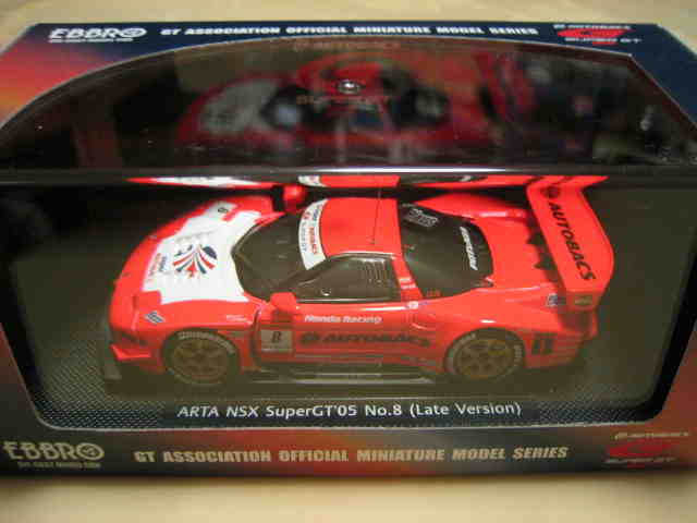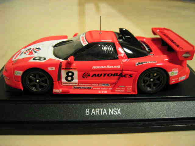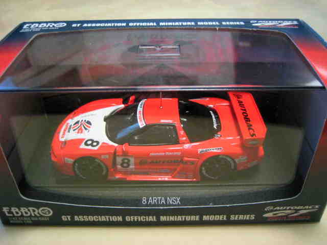 | 2004年12月21日登場。2004年8月22日に開催された第33回インターナショナルPokka1000kmに出場したマシンを再現。スポンサーロゴが一部異なるほか、フロントにカナードが追加され、ボンネットダクト形状も変化。 | 2004年12月17日、某スポンサーともめて発売が延期されていたARTA NSXがついに登場。ARTAのモデル化は1/43としてはニッコーに続き2回目、エブロとしては初。 | ||