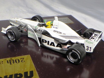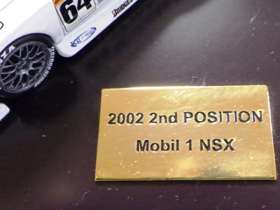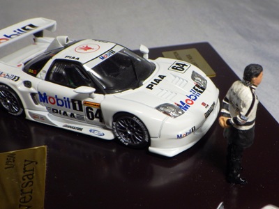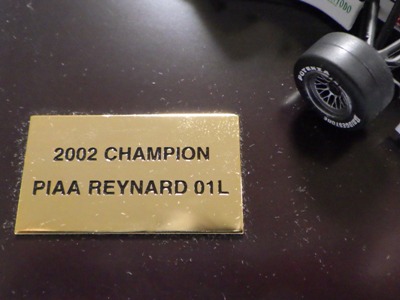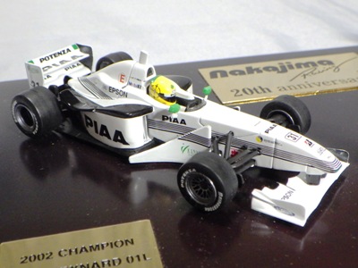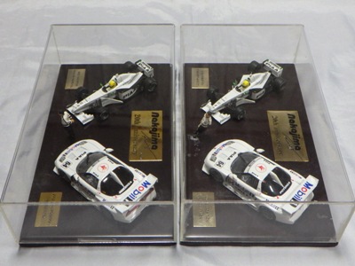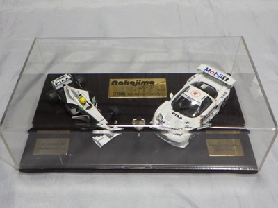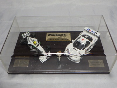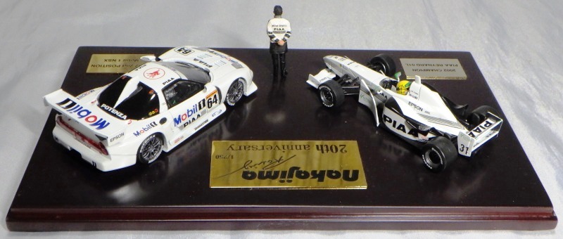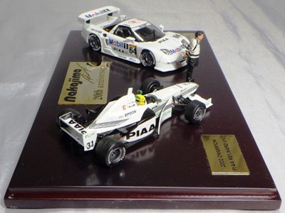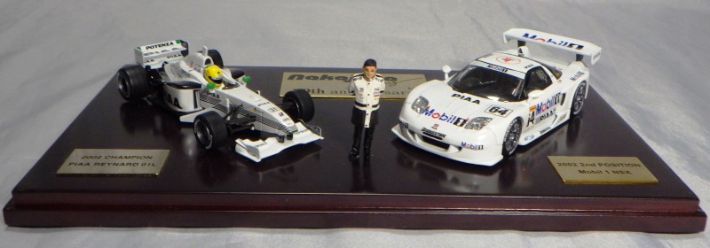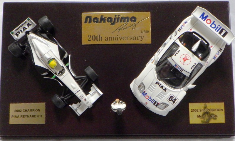 | 2009年8月ヤフオクに初登場したものを入手。2002年にフォーミュラニッポンで優勝したPIAAレイナード01Lと、1位に僅か1ポイント差で2位だったモービル1NSX2002の2台のエブロ製ミニカーと、中嶋悟監督フィギュアのセット。台座付きのアクリルケースに収まる。スポンサー向けの非売品と思われるが 、詳細は不明 。2011年5月1日、オークションに2度目の出品があったが、その商品には中央のプレートに「●/250」のシリアルナンバーが入っていたため、元々限定250セットの商品であったこと、また手元の商品が試作品であったことがうかがえる。 | |