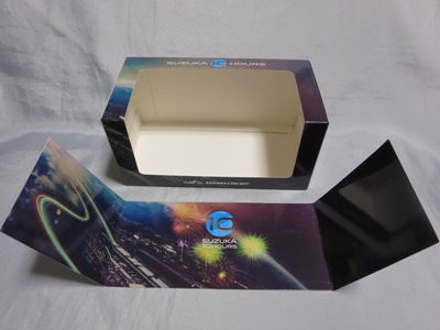 | 「鈴鹿1000km」の伝統を受け継ぎ、2018年8月24日から26日にかけて鈴鹿サーキットで開催された「SUZUKA 10 HOURS」の期間中に、サーキット内のショップにて販売されていた鈴鹿オリジナルパッケージ。上左画像は「SUZUKA 10 HOURS」公式パンフより。上右画像は「Buyee」より(パッケージ内の背面にドライバーのサインがプリントされた仕様になっていることが分かる。ケース上部の中嶋悟氏の直筆サインは後から入れられたもの)。未入手品。 | |