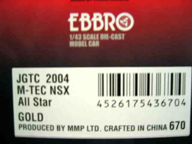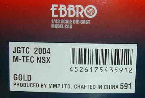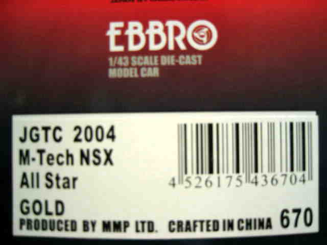 | 2004年11月22日鈴鹿GT300km開催当日、鈴鹿サーキット内ショップにて限定販売。中野信治、加藤寛規両選手の直筆サイン入り。エプソンNSXサイン入も同時販売された。タカタ同様証明書等なし。 | 2004年9月15日、当初の発売予定からかなり遅れてレイブリックNSXと同時に04モデル第2弾として登場。3000台限定。 | ||