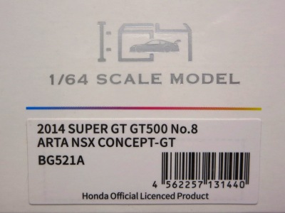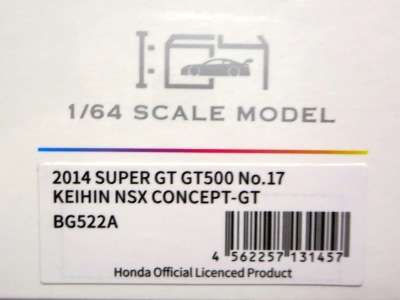 | 2015年9月末から発売延期を繰り返していた1/64GTモデル5種のうち「BG523A ウィダーモデューロNSXコンセプトGT2014」「BG524A エプソンNSXコンセプトGT2014」が2017年7月1日に発売。続けて「BG521A ARTA NSXコンセプトGT2014」「BG522A ケイヒンNSXコンセプトGT2014」「BG525A レイブリックNSXコンセプトGT2014」が7月20日に発売。 | |||