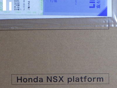 サイズは高さ9.5×幅15.0×奥行き5.0cm、重さは100g。素材はアクリルとアルミ。 メインタイトルは「ホンダオブアメリカ・5AA-NC1」となっており、その下の「タイプ」が「NSX」となっている。 その下に「駆動方式」「トランスミッション」「寸法・重量・乗車定員」「原動機」「性能」「動力用主電池」「動力伝達」「走行装置」の順に詳細な スペックが記載されている。 |