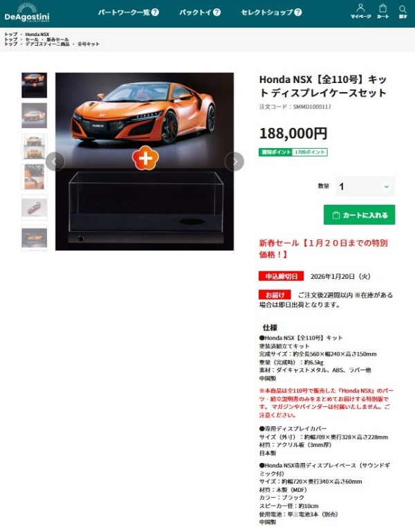 2021年1月4日に試験販売が開始された「週刊ホンダNSX」が、2021年7月14日に、ついに正規販売を発表した。 創刊号の発売は2021年8月17日を予定してい たが、8月14日に届いた。ちなみに届けられたゆうパックのパッケージには「お届け指定8月15日」というシールが貼られていた。 公開された公式サイトを見る限り試験販売版とほぼ同じ内容で、特典が若干変わっているようだが、問題は月刊販売を継続中の試験販売版をどうするのかということ。10号まで発売されている試験販売版は、現在も限定公開ページにて販売されている。 週刊の正規版が追いついた時点で一本化するのかも。 とりあえず正規版も注文してしまったので、当分2種類が届くことになりそうだが、ここまで来たら2セット購入してしまうかも。ちなみに、正規版では組み立てサービスコースが選べる。 私は、ハイクラスカーモデルコレクションやマガジンケースセットのオプションは注文したが、組み立てサービスについては、老後の楽しみのために、あえて注文しなかった。 ハイクラスカーモデルコレクションは、他社のものらしき1/18ミニカー6種が特定の号と一緒に送られてくるもので、かなり高額であるし、なおかつ入手済みと思われるミニカーが届きそうなのだが、デアゴスティーニオリジナルデザインのパッケージに期待して思い切って注文した。