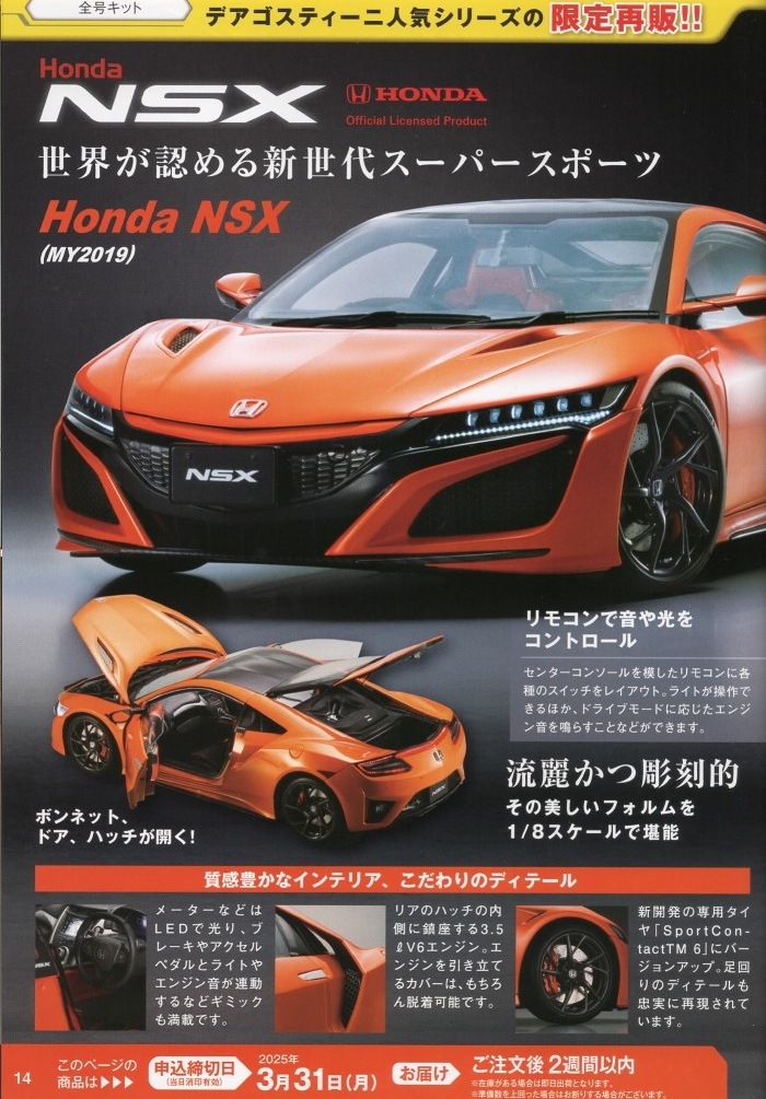 | 1/8 DEAGOSTINI(デアゴスティーニ)週刊Honda NSX(NC1)全国版 第64〜68号エコパッケージ版/各\1,790税込(\1,627+税) | |