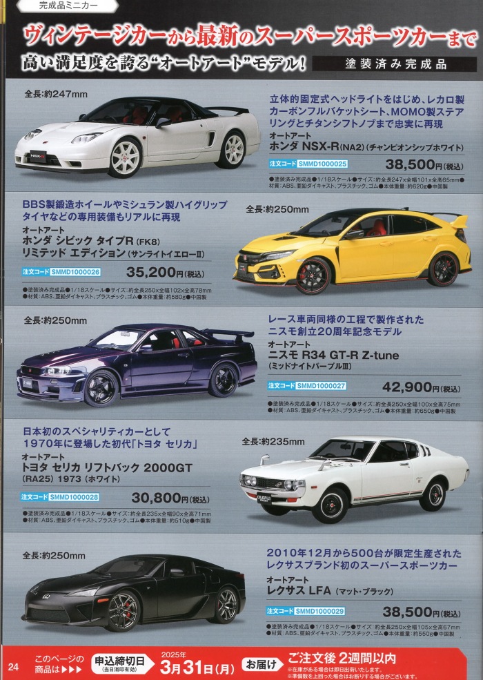 「週刊ホンダNSX-R」の定期購読優良特典として2024年11月17日に届いたデアゴスティーニ1/43「Honda NSX シリーズコレクション 第1回 Honda NSX Type-S 2021(カーボンマットグレーメタリック)」に同梱されていたカタログ。 表紙・裏表紙を含め(いずれにもページ数が振ってある)38ページの結構豪華なカタログで、14〜15ページに1/8「週刊ホンダNSX(2019)」の限定再販の広告があるため、NSXグッズ認定。 なお、デアゴスティーニでは完成品の販売もしているが、こちらはキット状態での販売。 マガジンやバインダーなどは付属しない、キットと組立説明書のみの特別セットのため、本来の110号分の定価195,600円(税込)より少し安め(約10%オフ)の176,800円(税込)となっている。 限定100セットの貴重なNSXグッズだが、店頭販売版とエコパッケージ版の2セットをすでに購入済みなので、さすがに手を出せない。 24ページには、なぜかオートアート1/18「NSX-R(NA2)チャンピオンシップホワイト」の紹介もされている。 「カタログ・書籍」コーナーに掲載すべきものだが、このNC1コーナーに掲載。 |