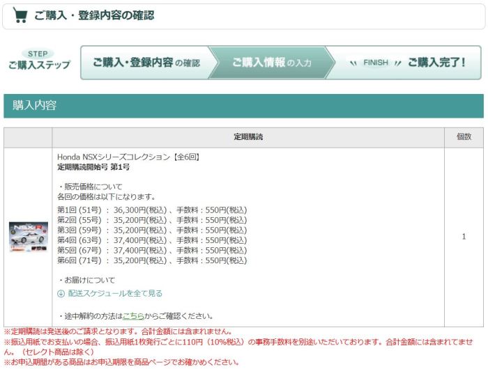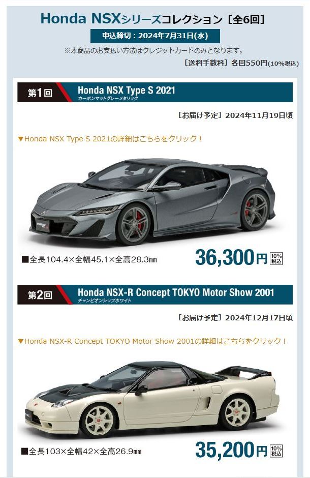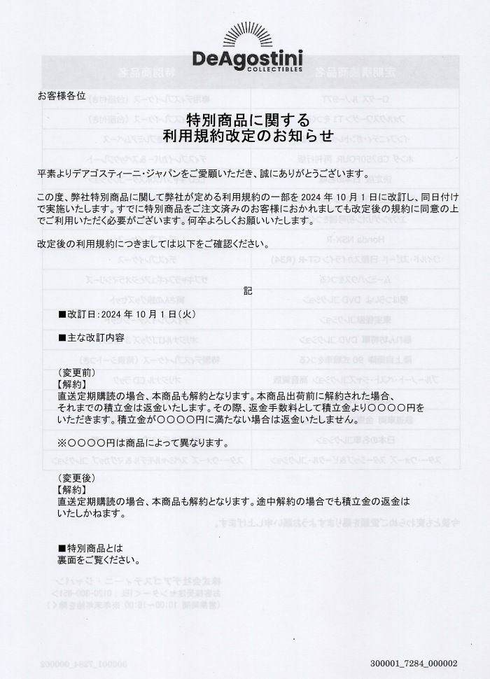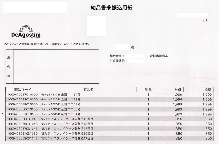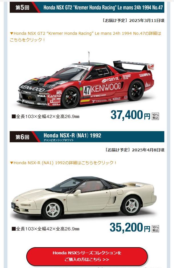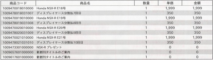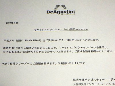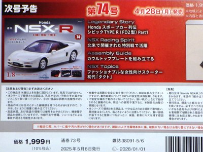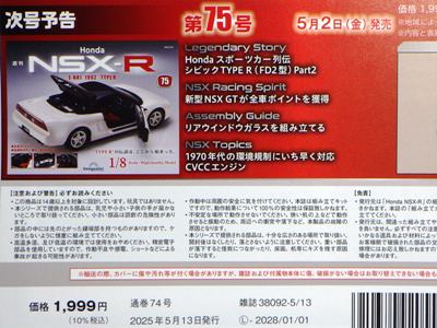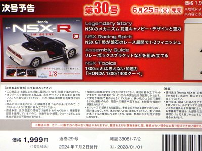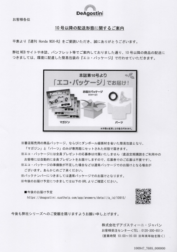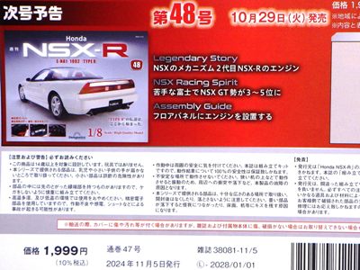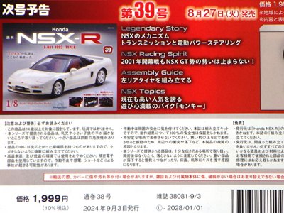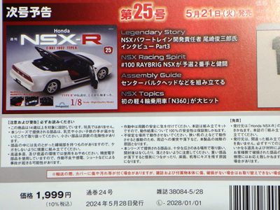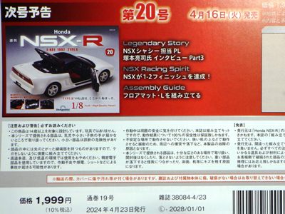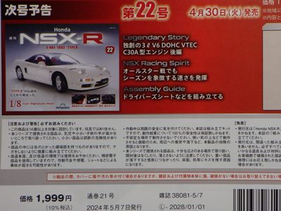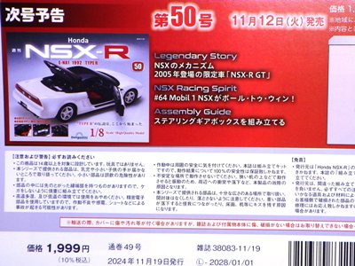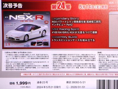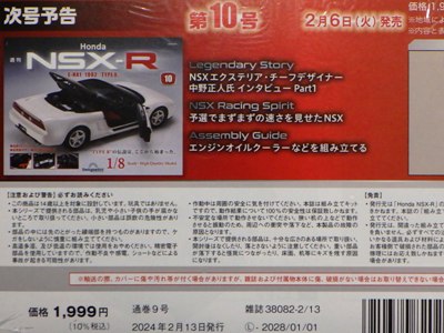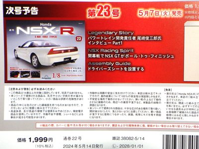 2023年10月15日にデアゴスティーニ「週刊ホンダNSX」エコパッケージ版最終セット第108〜110号が到着したが、それに同梱されていたのが、2023年2月14日に宮城・茨城・栃木限定で試験販売が開始され、2023年4月18日発売の第6号で休刊となっていた「週刊ホンダNSX-R」の全国販売開始の案内のチラシ。 もちろん定期購読を申込み、公式サイトでは2023年11月28日となっていた創刊を待っていたのだが、定期購読申込者には2日前の11月26日の日曜を配達指定日として11月22日に発送されており、予定通り26日に届いた。 試験販売版と比較すると、過去の商品同様にパッケージ裏面の発行日やバーコードが印刷されている部分が、試験販売版の黄色から白に変更になっているほか、中身では、定期購読特典にディスプレイケースが追加されている点とレーシングスピリットのコーナーのNSX-GTの画像が差し替えられている点が異なっているが、ほかはほぼ試験販売版と同じ。 NC1では途中からエコパッケージ版が出たことで2セット購入していたが、今回はどうするか迷い中。 NC1では通常パッケージのコンプセットが大量にヤフオクに出品されたので、それを狙うのもありかと考えている。 車両本体だけで490円+1,999円×109=218,381円という高額商品である。 |