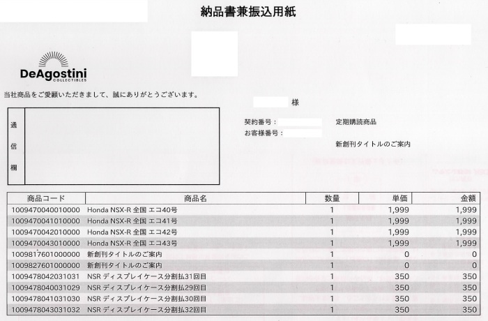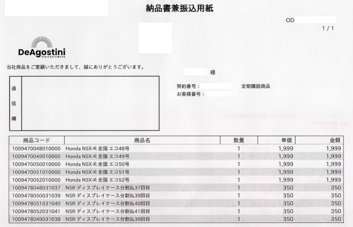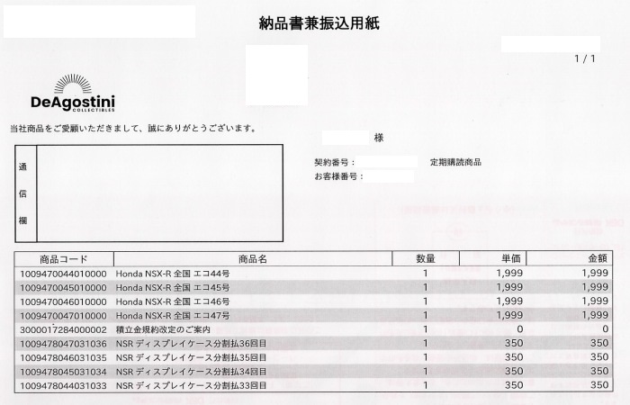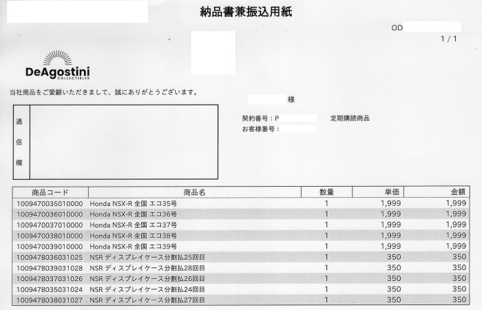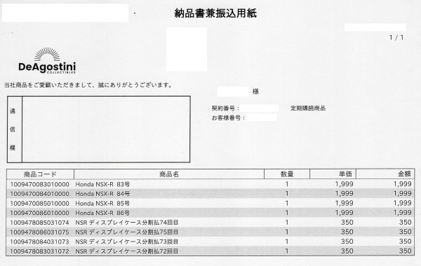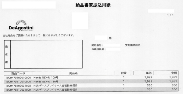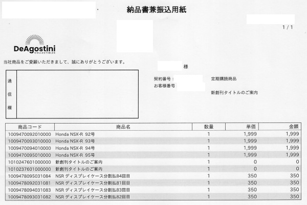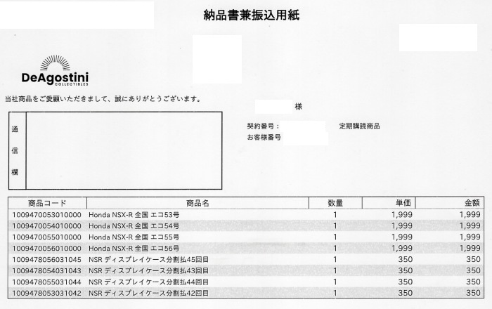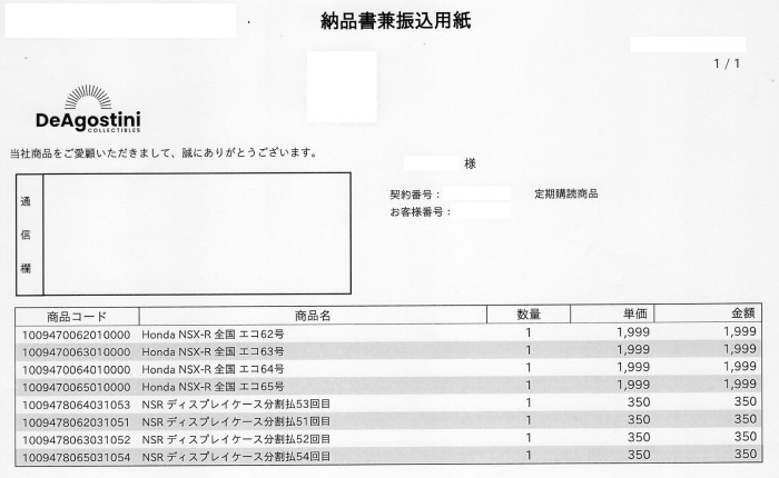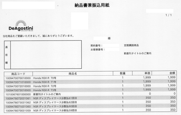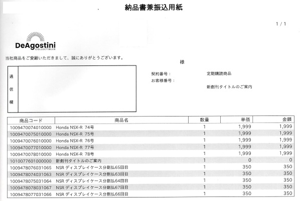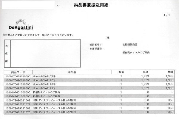 2025年12月27日に届いた巨大な段ボール箱の正体は、それまで毎月1回届くマガジン代と一緒に、350円ずつの分割払扱いになっていたデアゴスティーニ1/8「週刊ホンダNSX-R」ディスプレイケース。 第12号から110号まで99回の分割払になっていたので、350円×99回=34,650円。 NC1のときもベース19,800円、カバー12,800円で、合計32,600円という高額商品だったが、それを超えてきた。 とりあえず未開封のまま保管。 |