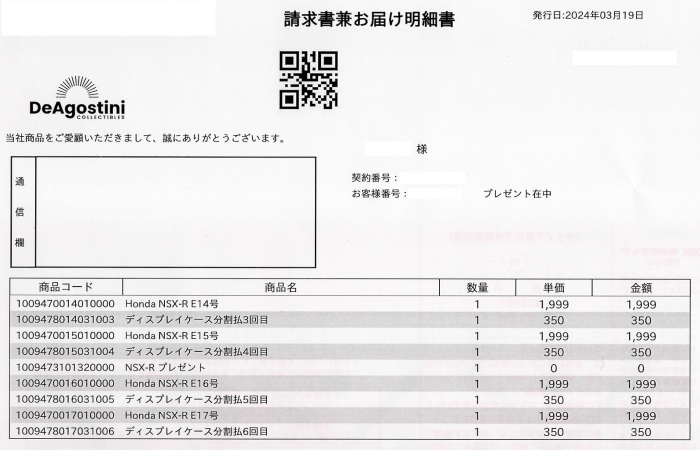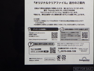 2024年4月19日に発送され、配達日指定の4月21日に4号セットで届いた。 第18号の本来の発売日は4月2日(火)。パーツの内容はシートレール。 第19号の本来の発売日は4月9日(火)。パーツの内容はフロアパンなど。 第20号の本来の発売日は4月16日(火)。パーツの内容はフロアマットLなど。 第21号の本来の発売日は4月23日(火)。パーツの内容はフロアマットRなど。 試験販売版でもプレゼントが予告されていたweb定期購読申込者限定のオリジナルクリアファイルが同梱されていた。 |