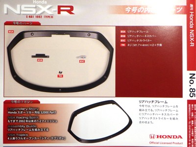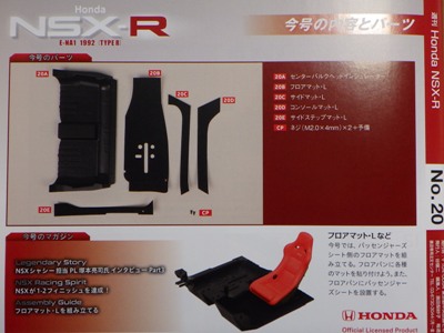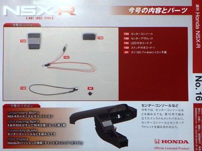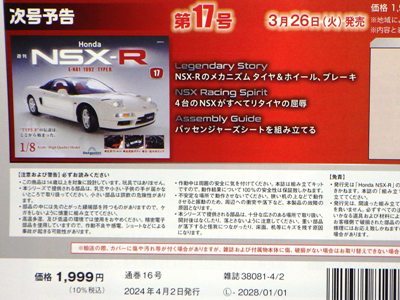 2024年3月19日に発送され、配達日指定の3月24日に4号セットで届いた。 第14号の本来の発売日は3月5日(火)。パーツの内容はグローブボックス。 第15号の本来の発売日は3月12日(火)。パーツの内容はコンビネーションメーター。 第16号の本来の発売日は3月19日(火)。パーツの内容はセンターコンソールなど。 第17号の本来の発売日は3月26日(火)。パーツの内容はパッセンジャーズシート。 試験販売版でもプレゼントが予告されていた読者全員プレゼントのカーボンプレートとキーホルダーが同梱されていた。 創刊号から第15号まで購読した読者対象の特典で、試験販売版では、第6号で休刊になったのでプレゼントが実現することはなかった。 カーボンプレートは、カーボン風ではなく実車と同じカーボンファイバー素材を使用しているのがポイントで質感が高い。 キーホルダーは、実車のセンターコンソールボックスに付属しているプレートをモチーフにしていると思っていたが、軽量化のためかNSX-Rにはクーペと違ってプレートが付属していない。 実際にモチーフになっているのは、サイドシルのスカッフプレート。 ちなみにNSX-Rのスカッフプレートは、92Rと02Rではデザインが異なり、他にクーペ用とカスタムメイド用があるので、プレート全体では4種存在している。 商品を店頭で購入している方は、各号についている応募券を送る必要があるが、Webから定期購読を申し込んでいる方は手続き不要。 |