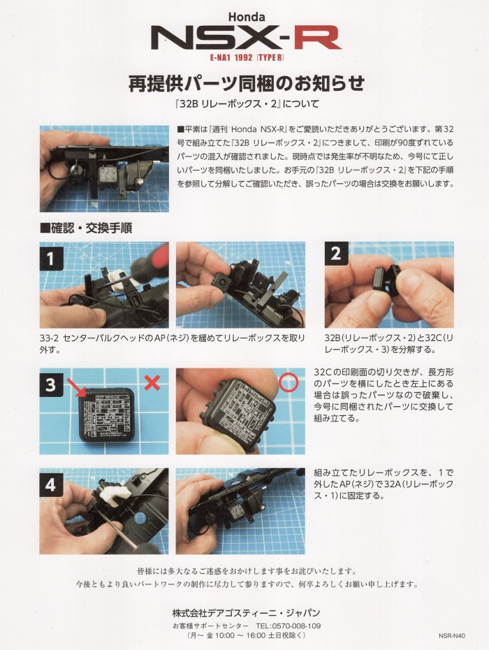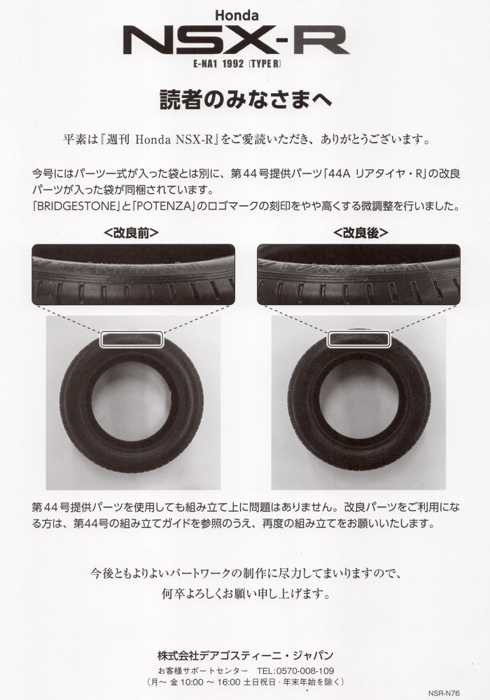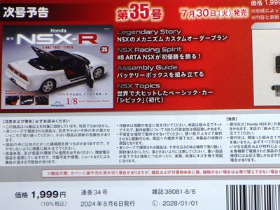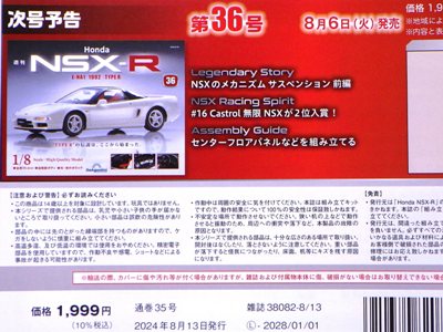 発送システムの変更で発送時期がこれまでより遅くなった。 第35号の本来の発売日は7月30日(火)。パーツの内容はバッテリーボックス。 第36号の本来の発売日は8月6日(火)。パーツの内容はセンターフロアパネルなど。 第37号の本来の発売日は8月9日(金)。パーツの内容はエンジンルームフロアパネル。 第38号の本来の発売日は8月20日(火)。パーツの内容はリアインナーフェンダー。 第39号の本来の発売日は8月27日(火)。パーツの内容は左リアタイヤ。 |