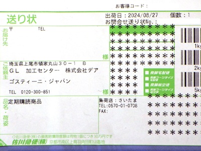 2024年8月27日に発送され、配達日指定なしで8月28日に5号セットで届いた。