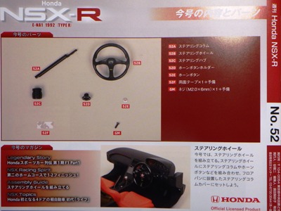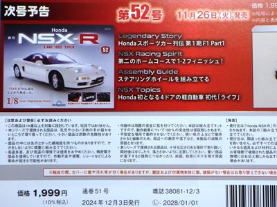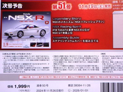 第48号の本来の発売日は10月29日(火)。パーツの内容はフロアパネル。 第49号の本来の発売日は11月5日(火)。パーツの内容はフロントスタビライザーなど。 第50号の本来の発売日は11月12日(火)。パーツの内容はステアリングギアボックス。 第51号の本来の発売日は11月19日(火)。パーツの内容はステアリングコラムカバー。 第52号の本来の発売日は11月26日(火)。パーツの内容はステアリングホイール。 |