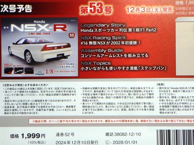 2024年12月16日に発送され、配達日指定日の12月22日に4号セットで届いた。 第53号の本来の発売日は12月3日(火)。パーツの内容はコンソールアームレスト。 第54号の本来の発売日は12月10日(火)。パーツの内容はフロントサブフレームなど。 第55号の本来の発売日は12月17日(火)。パーツの内容はリトラクタブルアーム。 第56号の本来の発売日は12月24日(火)。パーツの内容はフロントインナーフェンダーL。 |