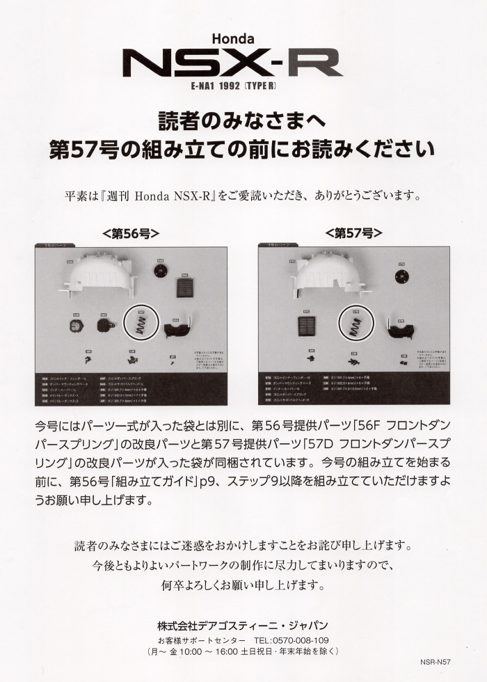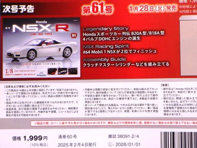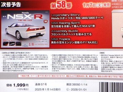 2025年1月22日に発送され、配達日指定日の1月26日に5号セットで届いた。 第57号の本来の発売日は12月27日(金)。パーツの内容はフロントインナーフェンダーR。 第58号の本来の発売日は1月7日(火)。パーツの内容はフロントバルクヘッド。 第59号の本来の発売日は1月14日(火)。パーツの内容はブレーキマスターシリンダーなど。 第60号の本来の発売日は1月21日(火)。パーツの内容はフロントバルクヘッド。 第61号の本来の発売日は1月28日(火)。パーツの内容はクラッチマスターシリンダーなど。 |