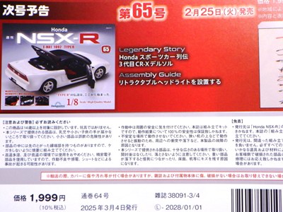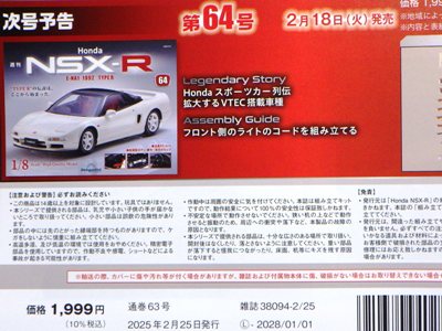 2025年2月17日に発送され、配達日指定日の2月23日に4号セットで届いた。 第62号の本来の発売日は2月4日(火)。パーツの内容はABSモジュレーターなど。 第63号の本来の発売日は2月10日(月)。パーツの内容はA/Cコンデンサーなど。 第64号の本来の発売日は2月18日(火)。パーツの内容は フロント側のライトのコード。 第65号の本来の発売日は2月25日(火)。パーツの内容は リア側のライトのコード。 |