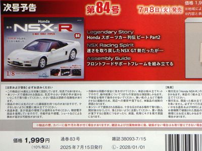 2025年7月15日に発送され、配達日指定日の7月20日に4号セットで届いた。 第83号の本来の発売日は7月1日(火)。パーツの内容はドアガラスR。 第84号の本来の発売日は7月8日(火)。パーツの内容はフロントフードサポートフレーム。 第85号の本来の発売日は7月15日(火)。パーツの内容はリアハッチフレーム。 第86号の本来の発売日は7月22日(火)。パーツの内容はリアハッチガラス。 |