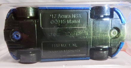 | 2015年11月22日にオークション初登場したアメリカのディスカウントスーパーチェーン「TARGET」限定のSNOWFLAKE仕様。NSXの他にNISSANフェアレディZ(初代)、TOYOTAスープラ(2代目)などが発売された模様。裏板刻印は「H38」、パッケージ刻印は「2575N」で、どちらも通常版と同じ。ただし、パッケージ裏面のデザインはTARGET版のみ他の2タイプとは微妙にデザインが異なっている。12月2日20:00現在の、このブルーモデルのオークションでの落札数と出品中の数は、通常版がそれぞれ9点と3点、トレジャーハント版が10点と4点、TARGET版が3点と2点となっている。 | |||||||||||||||||||||||||||