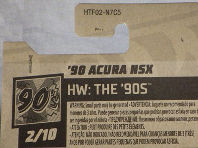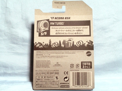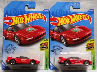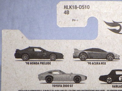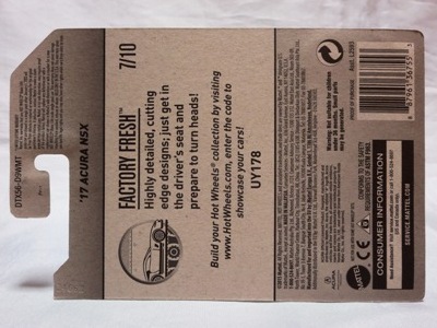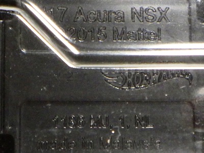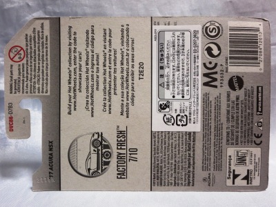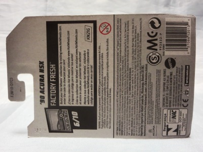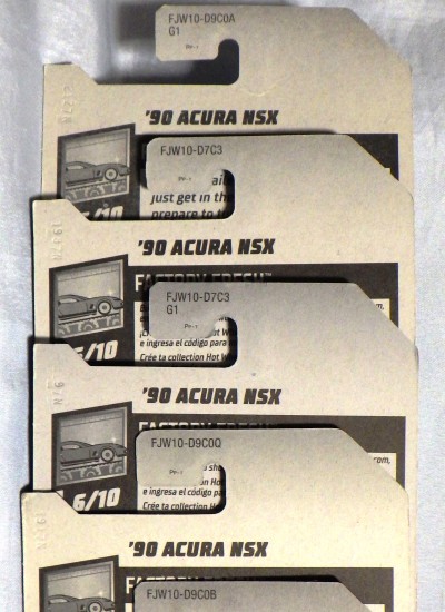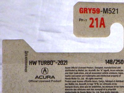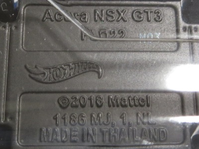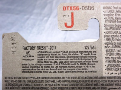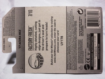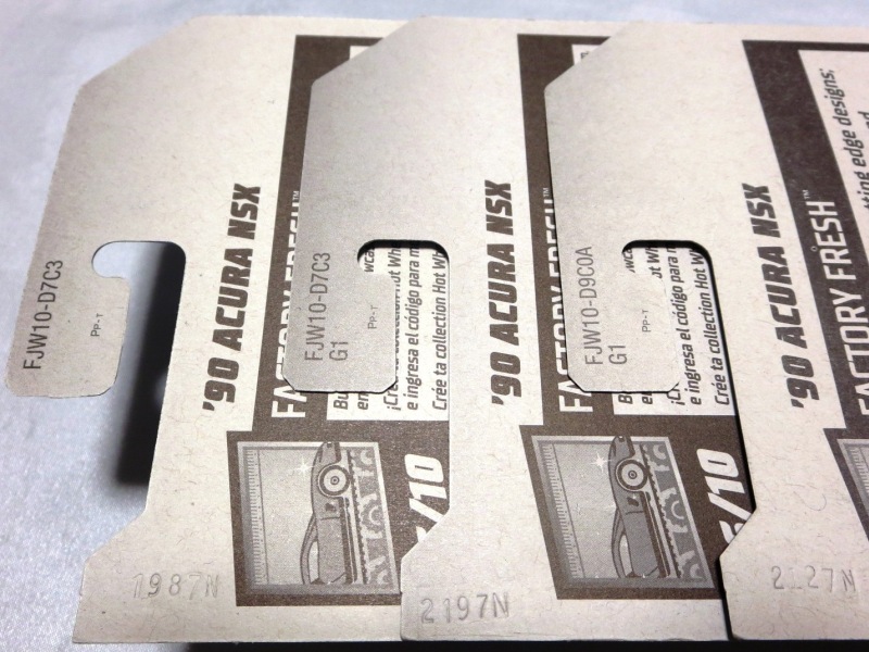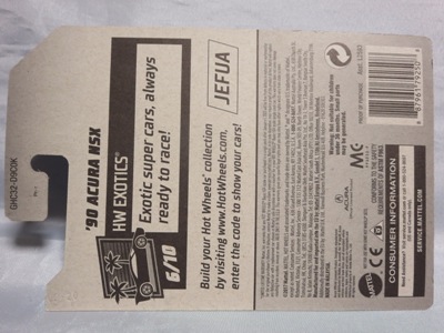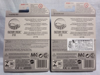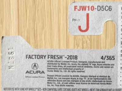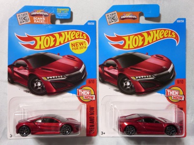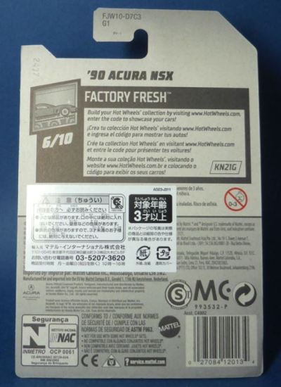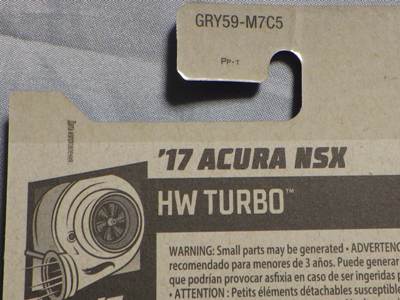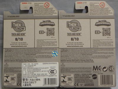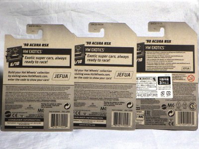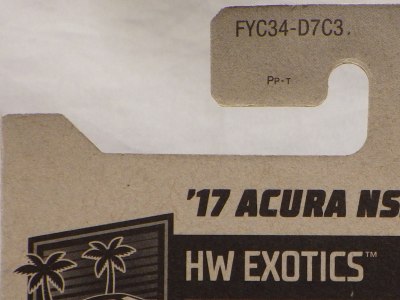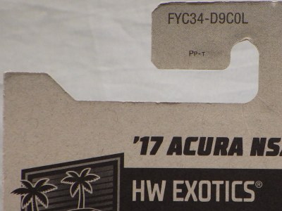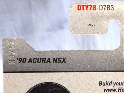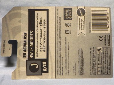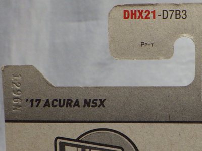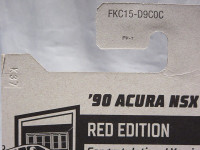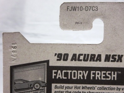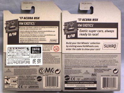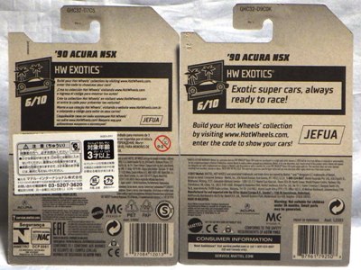 2018年4月28日にヤフオクに初登場した「MONTH2018」のシールの貼られた「’90ACURA NSX SILVER」を落札し入手。 2017年9月に「'17ACURA NSX YELLOW」で、同様のデザインの「MONTH2017」マークがパッケージにプリントされたものを入手したことがあるが、これはプリントではなく、シールが後から貼られている。 出品者によれば、アメリカのWALMARTで購入したもので、シールの位置はランダムだったとのこと。 7月に別の出品者から同じ入手して、それを確認した(購入したものはコレクション数にはカウントせず)。 どちらの商品もカードナンバーは「FJW10-D9C0Q」。カード刻印は「1917N」で、裏板刻印は「K29」だった。 |