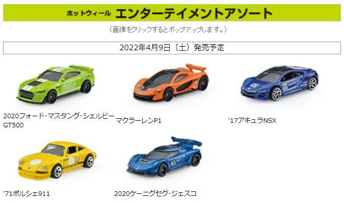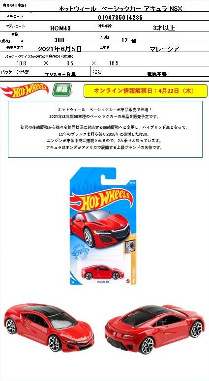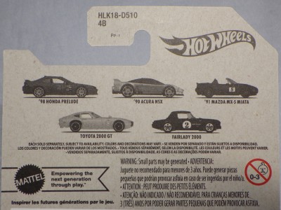 2023年2月4日にebayダイレクトショップで発見した新作。 2023年3月18日に正式に国内発売となった(amazonでの確認)。 シリーズ名はパッケージのどこにも記載がないが、「テーマオートモーティブアソート」と言う。 '98ホンダプレリュード、'91MX-5マツダミアータ、トヨタ2000GT、フェアレディ2000、そして’90アキュラNSXの5種となる。 NSXは2017年8月登場のファクトリーフレッシュ以来のシルバーモデル。 2023年3月16日にヤフオクに初登場したものを現地販売版だと思って、若干高めなのを気にせず落札したのだが、届いたものを確認したら、日本語シールの貼られた国内販売版であった。 桜を描いたと思われるパッケージ(5種共通)の美しさが大変印象的なモデル。 amazonの5種セットの参考価格が4,950円(実売価格4,528円)なので、1台あたり990円となるが、ヤフオクでは、2023年3月22日現在、5種セットが2,000〜2,500円、NSX単品が370〜680円で出品されている。 カードナンバー「HLK18-D510 4B」、カード刻印なし、裏板刻印「R52」であった。 後日同じ商品を入手したが、カードナンバーも裏板刻印も同じだった。 |