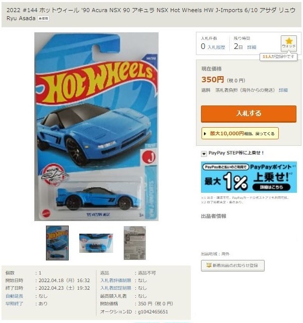 2022年9月7日にヤフオク初登場をご紹介し、様子見を宣言をしていたモデルだが、結局我慢ができずに落札した。 ’90 ACURA NSXでは2016年にNIGHTBURNERSシリーズでイエローモデルが登場しているが、それ以来となる。 未入手だった「J-IMPORTS RYU'S RIDES '90 ACURA NSX」ブルーの現地版を同時に落札することでシンガポールからの高めの送料を分散させ、9月22日に到着したが、このイエローはその日に国内からヤフオク初出品を確認。 開始価格100円と安くてショックだった。 カードナンバーは「HCX58-M7C5」、カード刻印は「07-22」、裏板の刻印は「R28」。 ブリスターパックの形状は、今回同時に入手したブルーの現地版と同じくミニカーリア部の凸部分が広くなったタイプ。 |