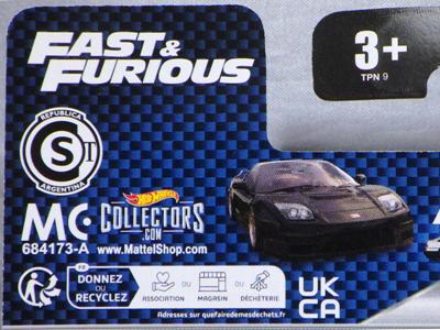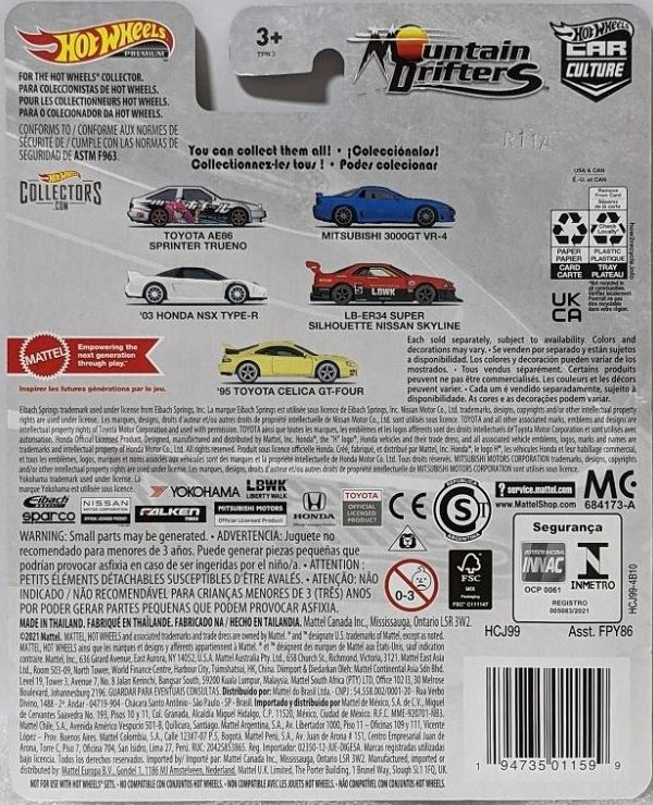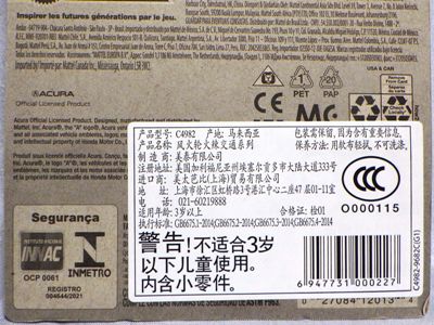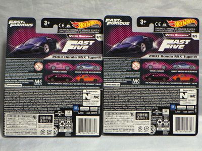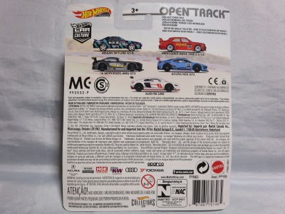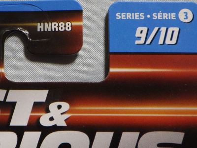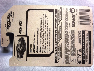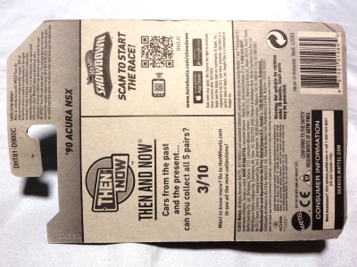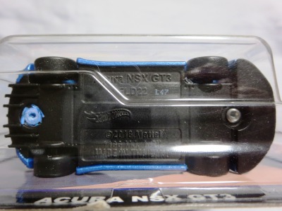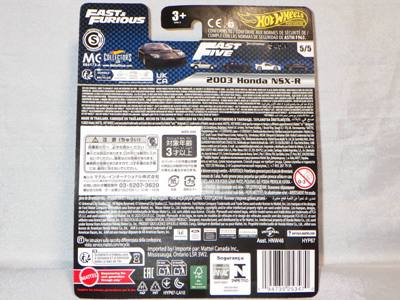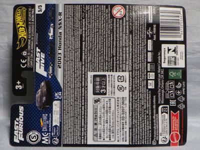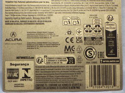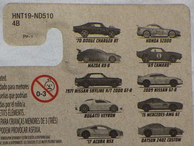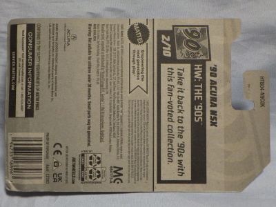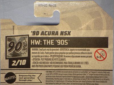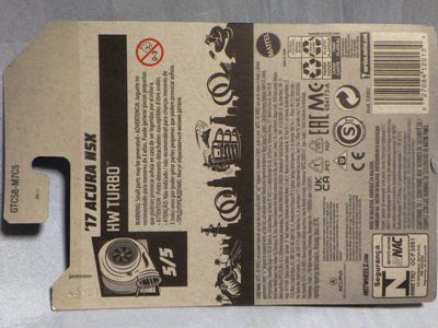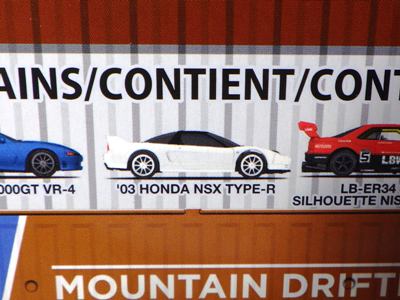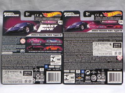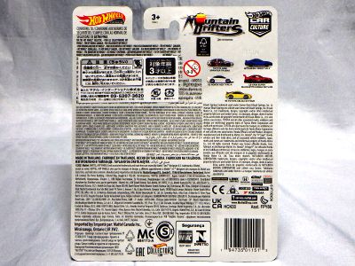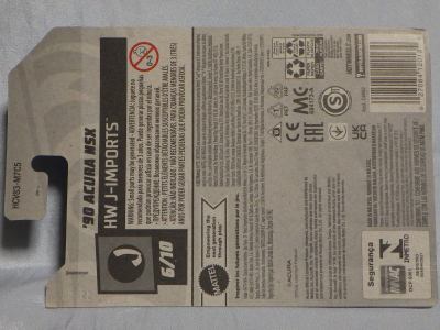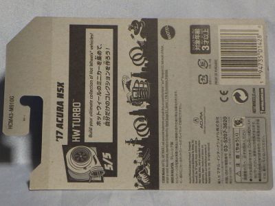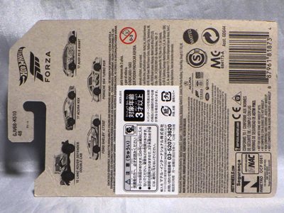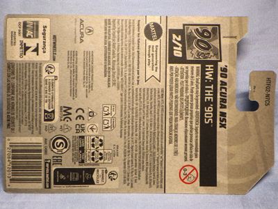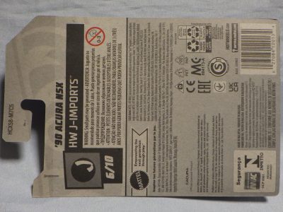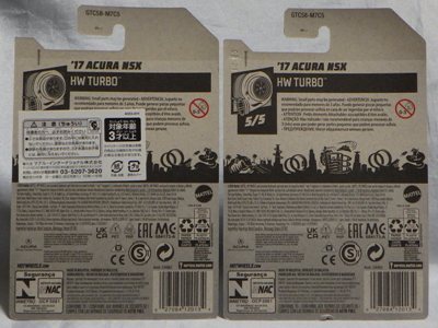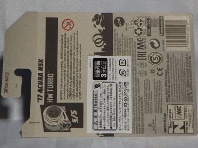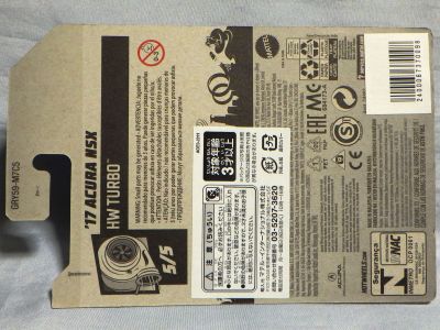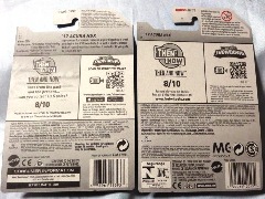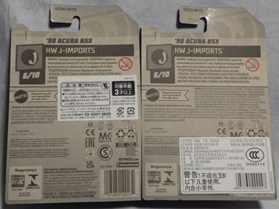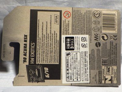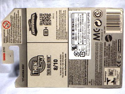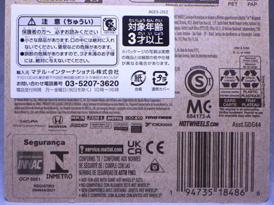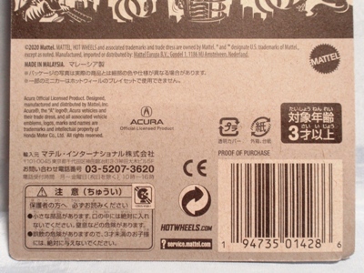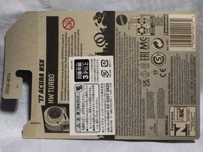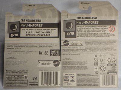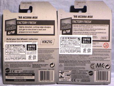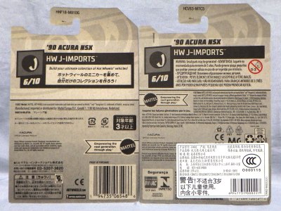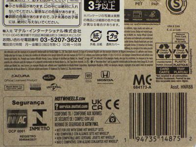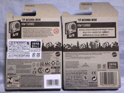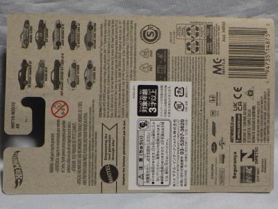 2020年4月にヤフオクに初登場した時は、日本語シールが貼られた正規輸入版は出回っておらず、現地販売版(並行輸入版)のみが流通し、それを入手したのだが、その後いつの間にか正規輸入版が発売されていたようである。 (ヤフオクの商品紹介画像では、裏面までなかなか載せてくれないので、正規輸入版の発見が遅れることが多い。) オモテ面のフック部分に違いがあるが、裏面は完全に異なっており、カード番号も違う。 現地販売版にあったカード裏の刻印はなく、ミニカーの裏板の刻印は「N08」から「N10」に変わっている。 ブリスターパックの形状もNC1のグリーンモデルやワイルドスピードのNSX-R同様に違っている。 カードの型番は「GHC32-D7C5」。 |