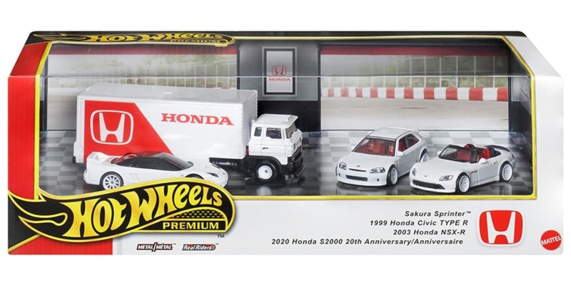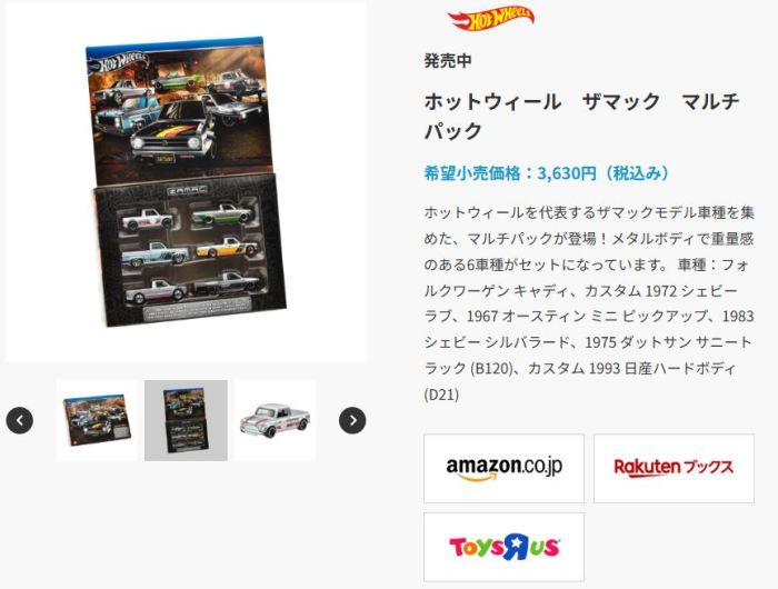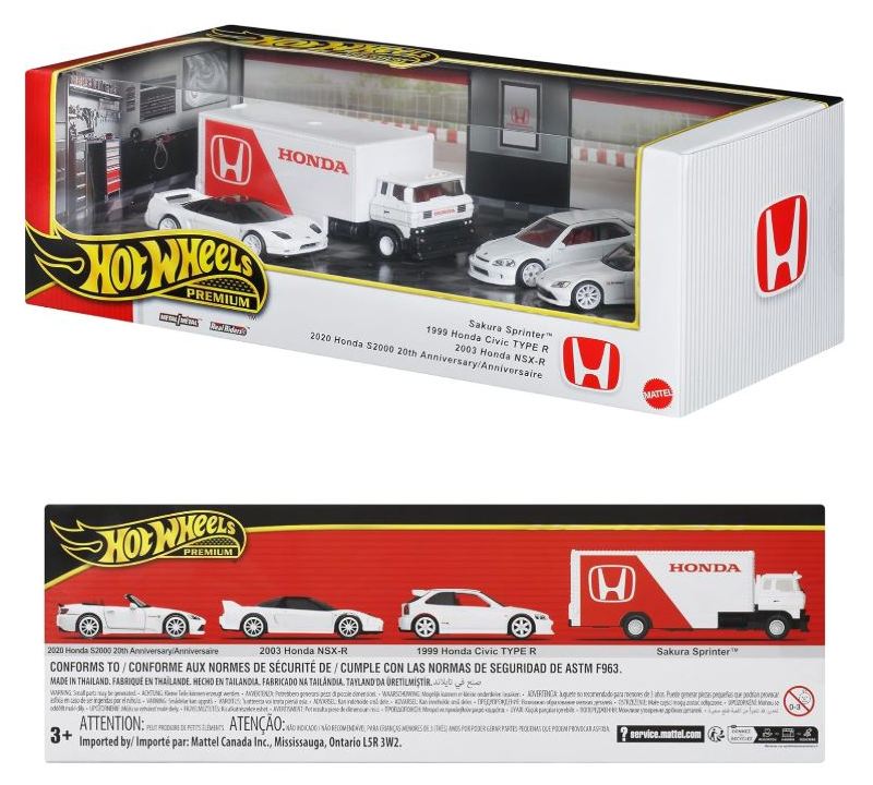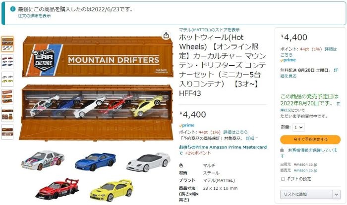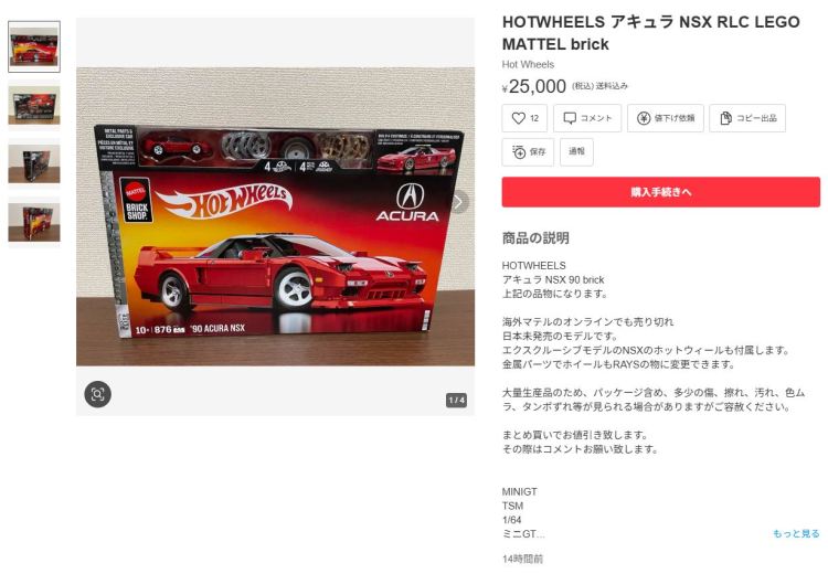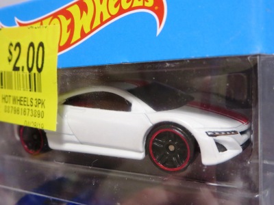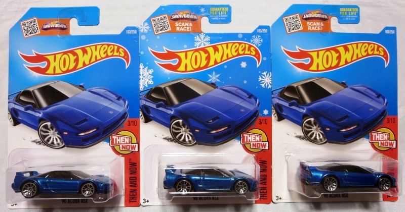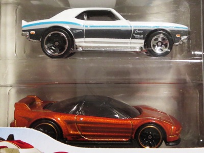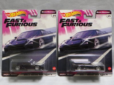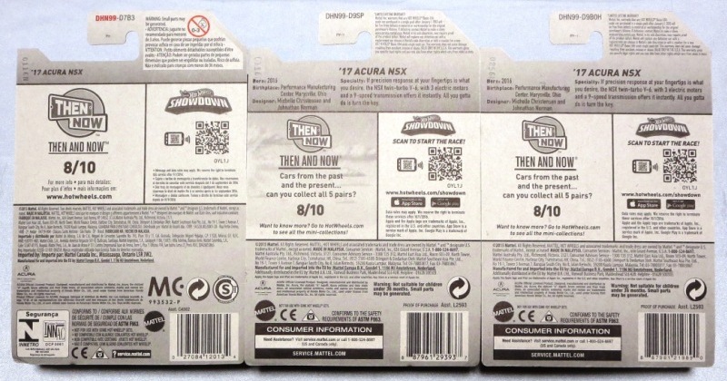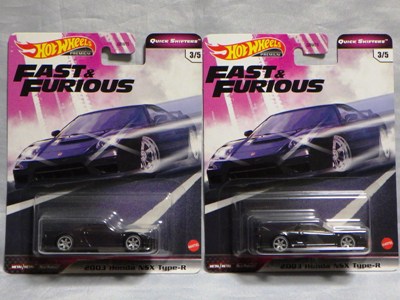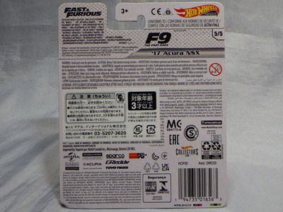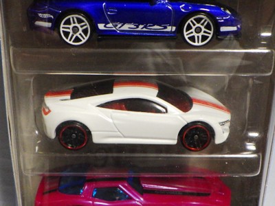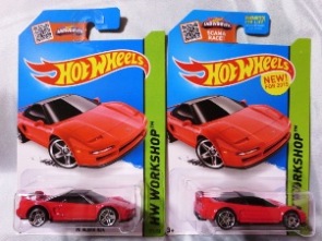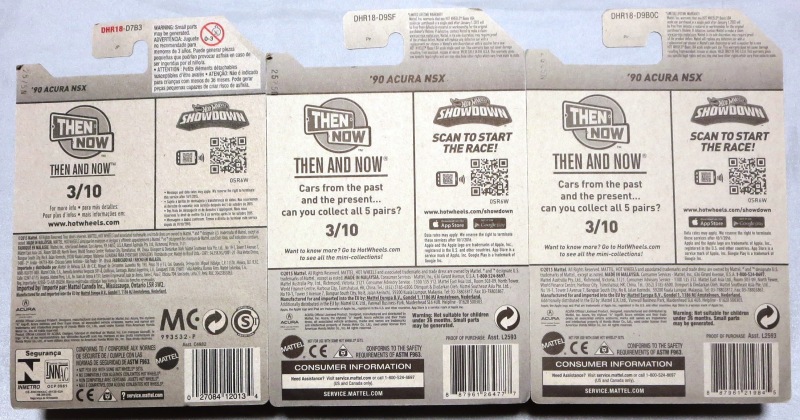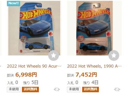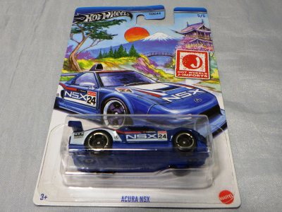 2024年8月23日に未知の「ホットウィール マルチパック9」が初登場し無事落札。 含まれているNSXは2022年9月に登場した「'90ACURA NSX イエロー J-IMPORTS(RYU'S RIDES)」で、直前に落札したマルチパック5に含まれていた'17ACURAのように、特別仕様というわけではなさそう。 NSXの他には先代のフェアレディZ(Z34・これは特別仕様っぽい)と先々代シビックタイプR(FK2)が確認できるが、そ れ以外の車種はよく分からない。 同じ'90ACURAのイエローモデルであるNIGHTBURNERZを含むマルチパック9は、2019年1月にe-bayで見たことがあるが、送料を含めると7,000円近い価格でとても手が出せなかった。今回は送料を含め2,280円だった。 |