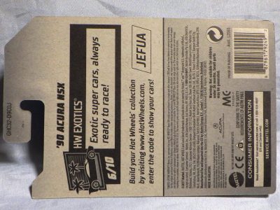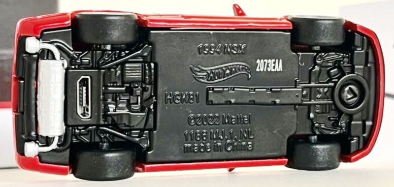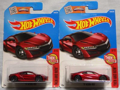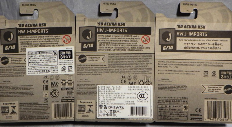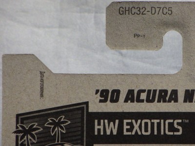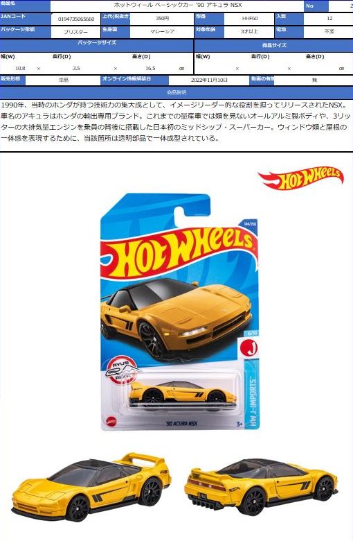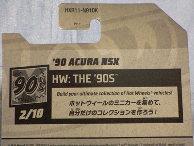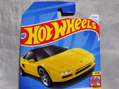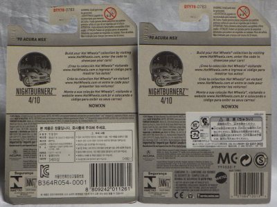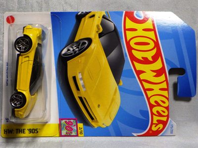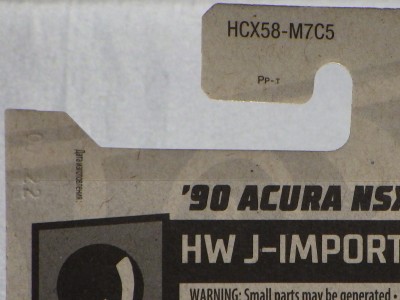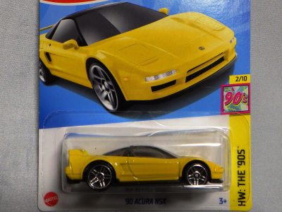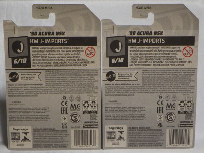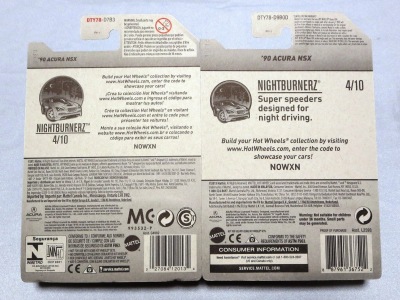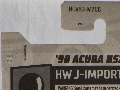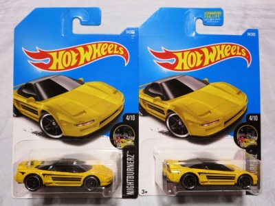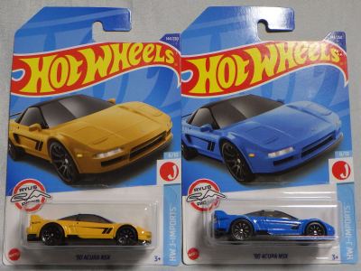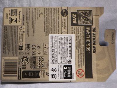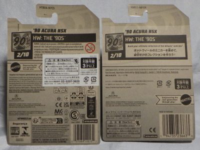 ホットウイールの新作は毎月第一土曜の発売で、2023年1月7日発売予定だったのだが、注文してあったショップから2022年12月29日にショップから届いた。 ホットウイールの’90 ACURA NSXイエローモデルは、2016年にNIGHTBURNERSシリーズで登場しており、デザインも似ているので注意が必要。 現地販売版は2022年9月7日にヤフオクに初登場し、入手済みのモデルでは、カードナンバー「HCX58-M7C5」、カード刻印「07-22」、裏板刻印「R28」であったが、今回の正規国内版は、カードナンバー「HHF60-M910N」、カード刻印なし、裏板刻印「R31」であった。 ブリスターパックの形状は、近年のセオリー通り、現地販売版がミニカーリア部の凸部分が広くなっているのに対し、フロント部が広くなっている。
