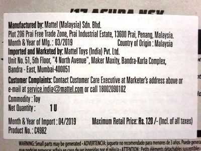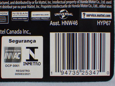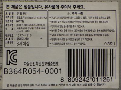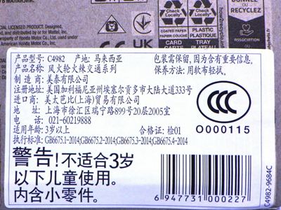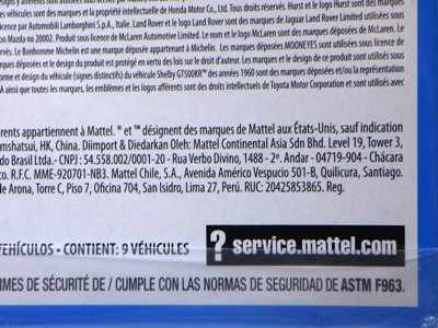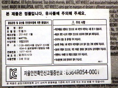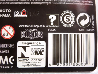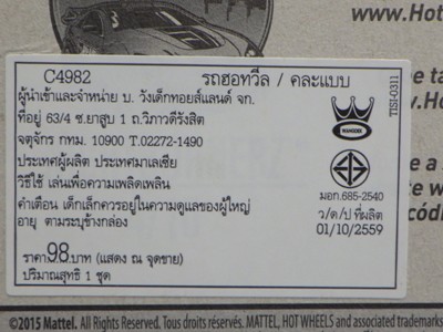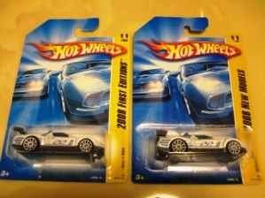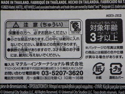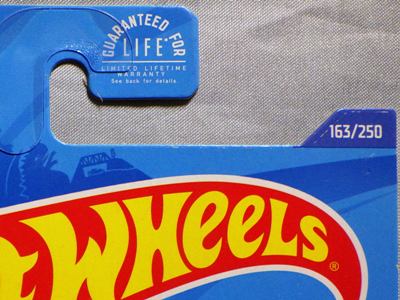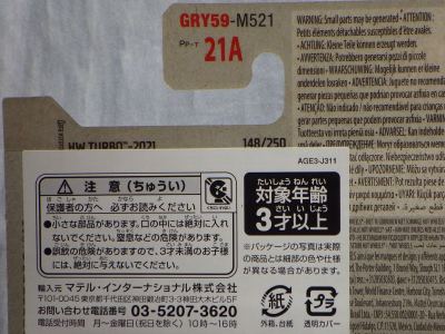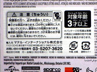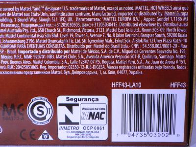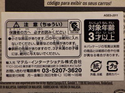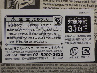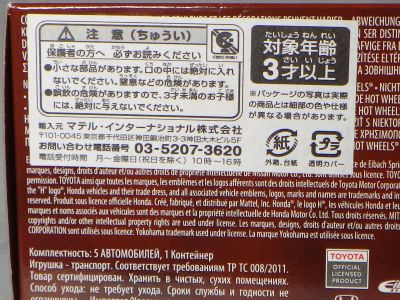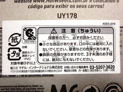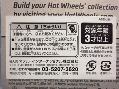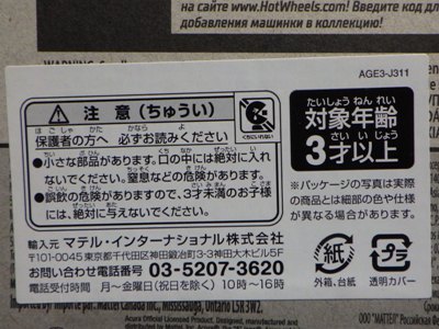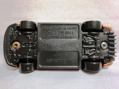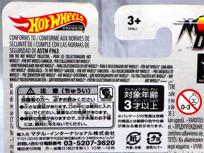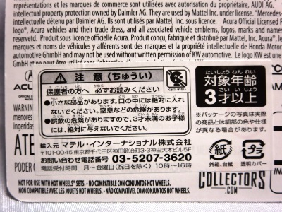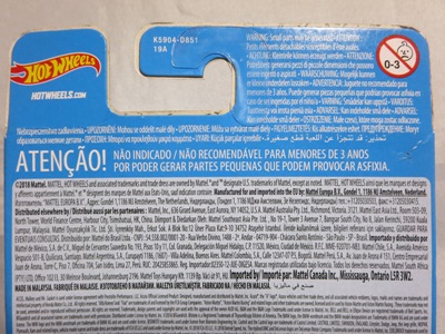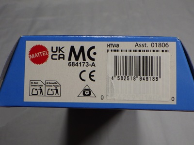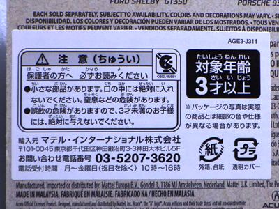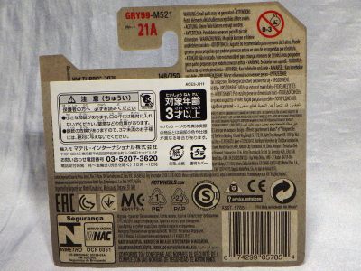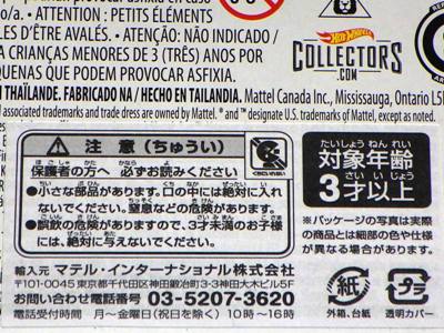 2008年6月購入。 2008年5月発売。 白タイプと異なりパッケージがショートカードとなって表裏共に日本語表記され完全に日本仕様になっている。 トイザらスでの販売価格は248円。 白黒ともに輸入元はマテル・インターナショナル株式会社で車自体に変更なし。 カードの品番は「N5934-0617」。 カードの刻印は「0408N」。 裏番の刻印はない。 |