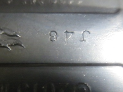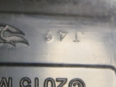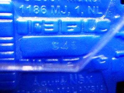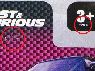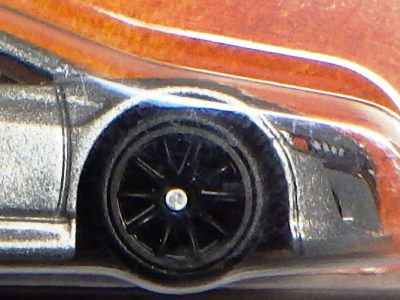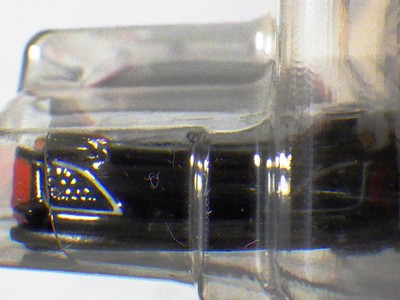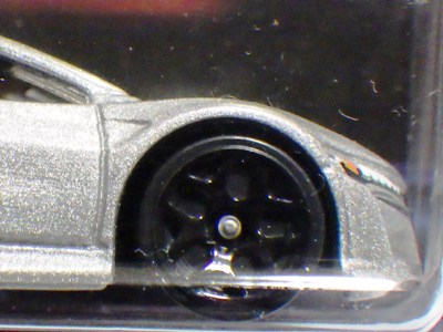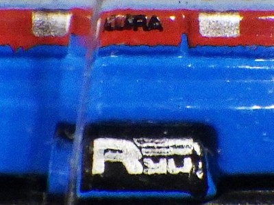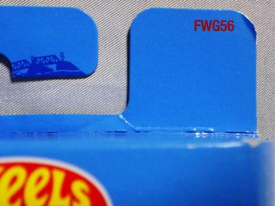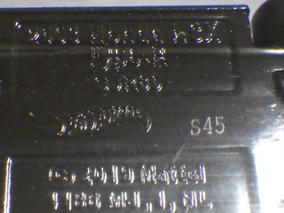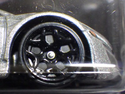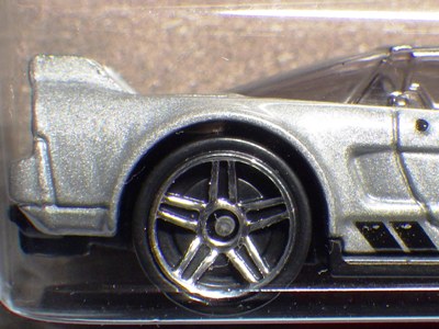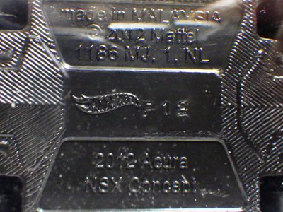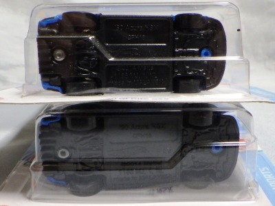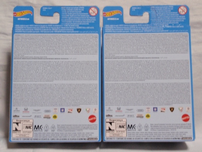 2017年9月28日にヤフオクに出品されたファクトリーフレッシュのシルバーの画像が、先に入手していたものと異なっていたので落札(左の画像の右側がその入手品)。 カードの表面は全く同じなのだが、裏を返すと右側のフック部分のナンバーに「G1」の文字が追加されている(下の比較画像参照。以降右列が今回の入手品、左列が先の入手品の画像)。 コード番号の文字が追加されているということは、どこかに仕様変更があったはずなのだが、どこが異なっているのか見つけることができなかった。 刻印は「1987N」から「2197N」に変更されている。 ミニカーの裏板の刻印も「K29」から「K32」に変更されている。 ナンバープレート部分のホットウィールのロゴがなくなっているのも変更箇所かと思ったら、どうもリアのタンポ印刷が大きく下にずれているだけのようである。リアのガーニッシュ部分へのタンポ印刷が、その下のバンパー部分にプリントされてしまっているのが分かる。 |