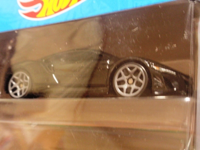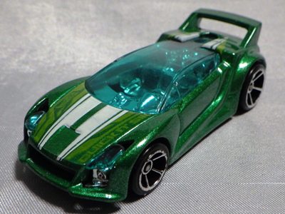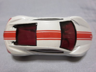 2012年1月24日ヤフオクに初登場。 モデル形状はこれまでに発売されていたタイプと同じ。 ボディカラーはメタリックグリーン、裏板を兼ねたボディ下部はブラック。 リアウイングは成形色のオレンジ、エアスクープと内装はシルバーメッキ。 ウインドウはクリア、ホイールはメッキオレンジ。 シリーズ名「RACE COURSE'12」の「’」が抜けている。 カードの品番は「V5485-07A1」。 カードの刻印は「3111N」。 裏板刻印は「D45」。 |