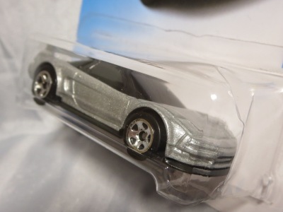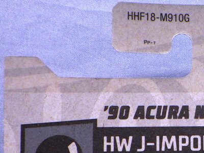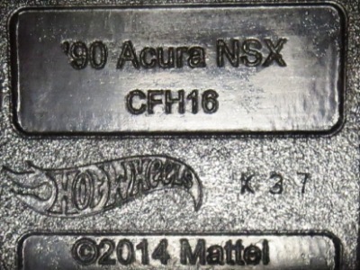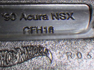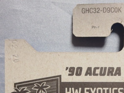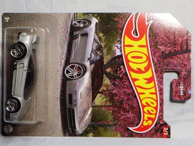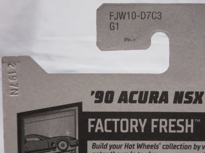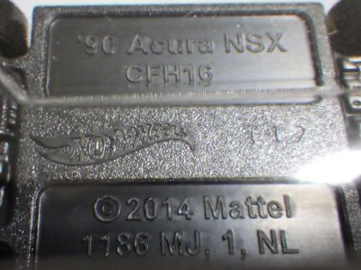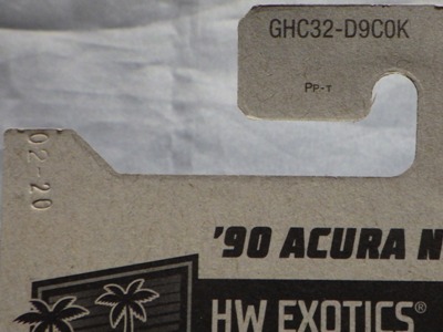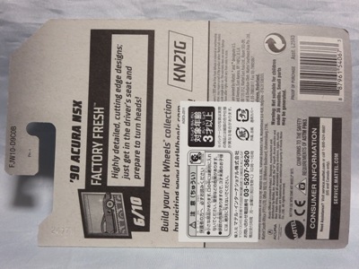 2017年8月にヤフオクに初登場したホットウィール「FACTORY FRESH」シリーズの'90ACURA NSX シルバータイプは、カードナンバーで言うと「D7C3」、それと違いの分からない「D7C3G1」、50周年ロゴ入りの「D9COA」、それに日本語シールの貼られた「D9COB」、オモテ面に「2018MONTH」シールの貼られた「D9COQ」、ショートカードの「D6C7」の計6種を確認していたのだが、「D7C3」に日本語シールが貼られた7種目の商品を2022年7月にヤフオクで入手。 輸出専用のカードがあるわけではなく、現地で販売されている商品そのものを輸入して、日本でシールを貼って販売しているということなのだろう。 カードの刻印は、「2197N」で、ミニカー裏板の刻印は「K32」。 |