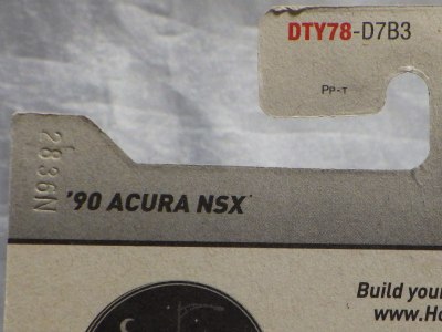 2022年7月に入手。 「NIGHTBURNERZ」シリーズの'90ACURA NSX イエロータイプは、カードナンバーで言うと「DTY78-D7B3」、そのマイナーチェンジ版「DTY78-D9B0D」の2種に、ショートカードの「DTY78-D5B6」の計3種を入手していたのだが、「D7B3」に日本語シールが貼られたものと、韓国語シールが貼られたものを新たに入手。 裏板の刻印はショートカードのみ「J45」で、あとはすべて「J42」だったが、「D7B3」カードで裏板刻印が「J44」のミニカーが入った商品も所有している。 カードの刻印はどちらも「2836N」で、最初に入手した「D9B0D」カードと同じなのが不思議。 |