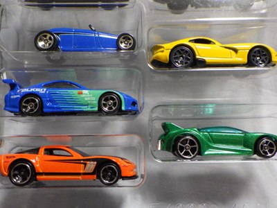 | 2008年4月フランスのコレクターより入手。 2セットで送料込26ユーロで購入したとのこと。 上からロータスエリーゼ、HSC、フォードシェルビーコンセプト、ポルシェカレラGT、ジャガー。ブラックシャーシタイプ。 発売は2007年だったらしい。 |