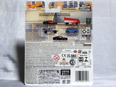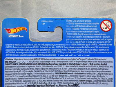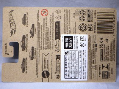 | 2006年12月ヤフオクにて購入。 このブリスターパックは日本にマテルインターナショナルによって輸入されたもので、表面だけではなく裏面もデザインが変わっている。 パッケージにシリーズ名の記載はない。 ミニカー自体に変更点はない。 裏版は黒いブラックシャーシ。 日本語のシールが裏面に貼られている。 カードの品番は「J8030-1916A」。 カードの刻印、裏板の刻印はない。 |