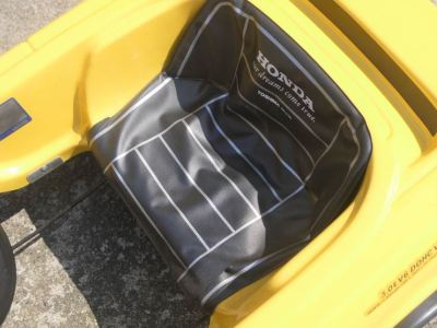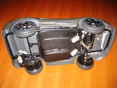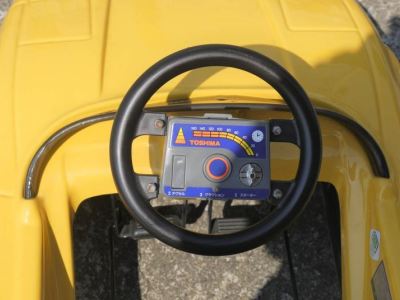 | バッテリー(KOBE 6V 10A)はフロント下部に設置されており、モーターは左後輪を駆動する。全長92cm、巾52cm、高さ45cm。車重10キロ。 | |