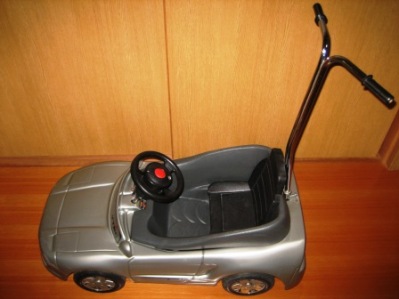 | 手押し式に変更した状態。手押し用ハンドルによって前輪を操作可能。ハンドルはボルト1本で固定されているだけなので、ペダルカーにするときは簡単に取り外すことができる。バスタブ型のパーツとシートも1つのダイアル式ネジで固定されているだけなので変更は簡単。 | |
