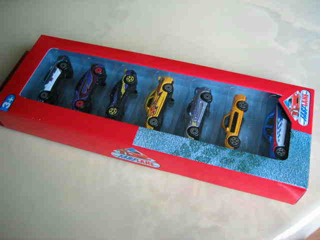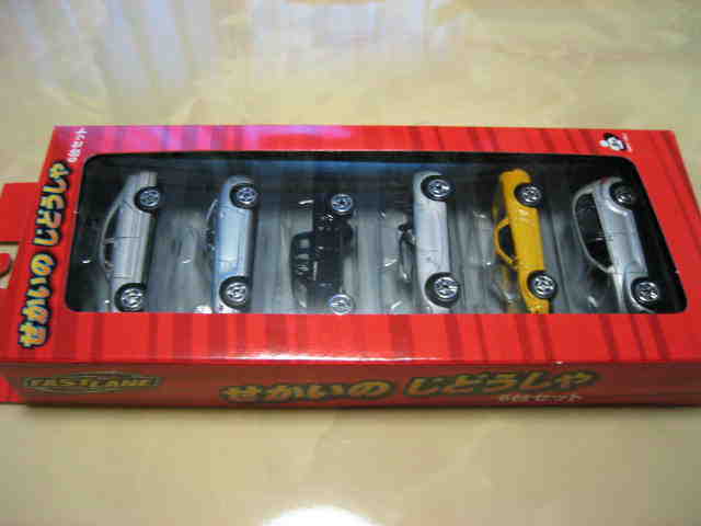 | 2006年1月国内のトイザで購入。フランス版同様に、上からベンツC銀、マスタングマッハV蛍光赤、クライスラークロスファイヤー銀、NSX黄、VW NARDOオレンジ、BMWZ4銀の6種。 | |