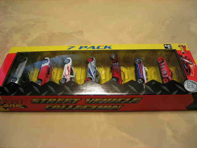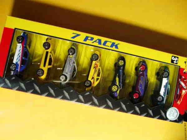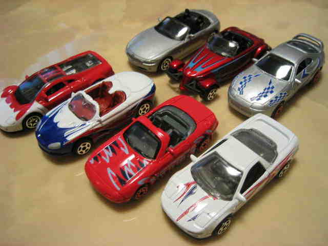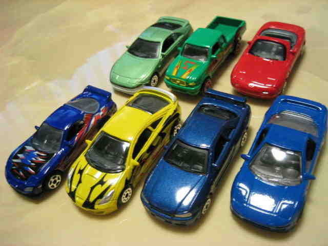 | 2004年12月にアメリカより購入。日本未発売。パッケージの上から順にNSX(青・ドアにオレンジの模様入り)、トヨタエクストラキャブ(緑)、MX-5ミアータ(ロードスター・赤)、300ZX(Z32・うぐいすメタ)、RX-7(紫)、セリカ(黄)、スカイラインGT-R(R34・紺メタ)の7台セット。2003年製。 | |