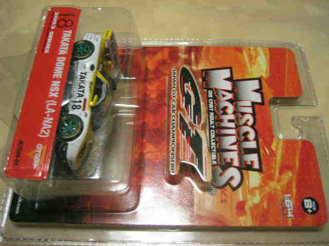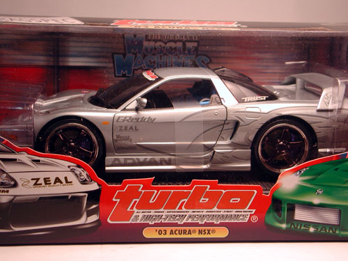 マッスルマシーンズ1/18(FUNLINE) 2003年12月には1/18スケールも登場(トレジャーハントさん価格5,460円)。新型NSXのチューニング仕様で、ENDLESSロゴをはじめとするリアルなタンポや、シートベルトはもちろんナビまで取り付けられた内装など非常に芸が細かい傑作です。20インチはあろうかというメッキホイールからはスリット入りのローターが見え、室内に目を移すとボディ同色のインパネ、バケットシートが目立ちます。2004年3月には'03アキュラのガンメタとブルー(イケダさん・トレジャーハントさん価格5,460円)、4月上旬には'04アキュラのホワイトとパープル(トレジャーハントさん価格5,460円)が追加。4月下旬にはターボシリーズのアキュラ'03のブルーとシルバー(トレジャーハントさん価格5,460円)が追加と、まさに新製品ラッシュです。 |