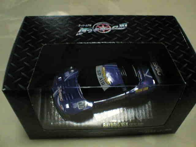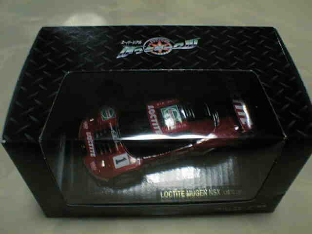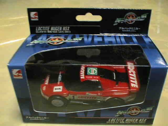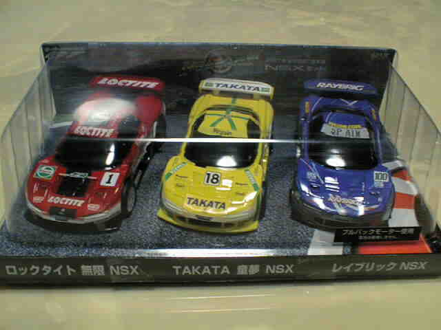 | 鈴鹿で購入。ブリスターパッケージだが、裏面のタイヤの部分がくり抜かれパックされたまま走行可能という斬新なパッケージ。かっとビークルシリーズ2番目のパッケージ。 | ロックタイト無限、タカタ童夢、レイブリックの2001年JGTCモデル3点セット。@カータイプとは違いリアル路線のプルバックカー。スポンサーロゴなどはタンポではなくシール。 | ||