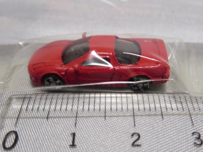 2016年6月27日にヤフオク初登場の鉄道模型のアクセサリー用ミニカー。初登場と言っても4年近く前の2012年10月に発売されたものであり、商品名が「スポーツカー(1)」というもので、NSXを名乗っていなかったため、これまでノーマークであった。もしかしたら、この商品名ではヤフオクで過去にも出品歴があったかもしれない。 Nゲージスケール(1/150)で、本来なら約29.5mmとなるはずだが、実際には27mmくらいしかなく、2006年10月に缶コーヒーのボスの景品としてデビューした32mmのミニカーの記録を超える歴代最小のNSXミニカーと認定。 こんなに小さいのに定価は1,512円もするが、ウインドー類にはきちんとクリアパーツが用いられており、このサイズのミニカーではあり得ないドアミラーまで極小で再現されている。 |
