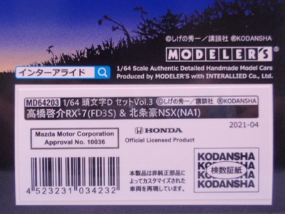 | 2021年4月2日に受注を開始していたモデラーズ1/64「頭文字DセットVol.3 高橋啓介RX-7(FD3S)&北条豪NSX(NA1)」が7月9日にやっと発売。 パッケージにも色々な演出があり楽しめる。 |