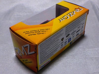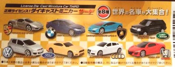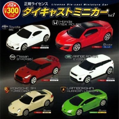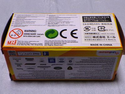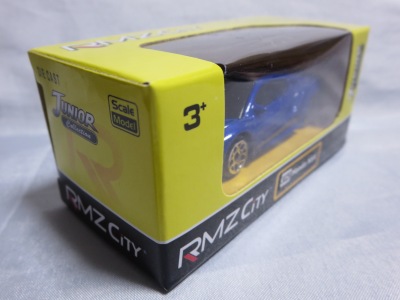 の商品であることが判明。 本来1台300円なのに他車とのセットで3,500円もしたため、楽天で1台380円でバラ売りされているのを見つけて購入したところ、前述のRMZ Cityミニカーとまったく同一の商品であることが判明。 サイズはほぼトミカサイズの7cmでスケールは1/64。ガラス部分はクリアパーツではないが、100均ミニカーのようなチープさはなくトミカに負けない質感がある。ガチャ用のミニパンフ付属。 |