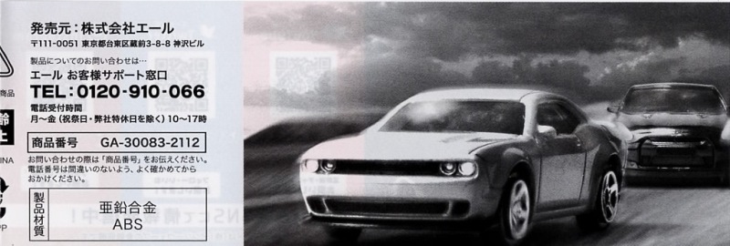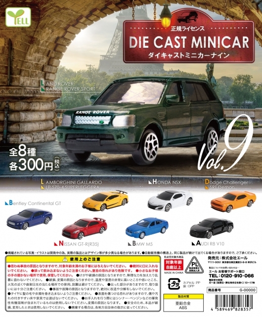 2021年12月30日にプラッツのカプセルトイと同時発売になり、同時にヤフオクに出品されたものを落札した。 2021年10月に入手したボックスタイプのものも発売元はエールであった。 エールは2008年に東京で設立された玩具・雑貨の企画・製造・販売・輸入を行っている会社。 取り扱い商品のメインは、かわいい動物系のカプセルトイで、ミニカーは珍しい。 今回の商品のラインナップは、ホンダ・NSX(NC1)(ホワイト)のほか、ランドローバー・レンジローバースポーツ(グリーン)、ランボルギーニ・ガヤルドLP 570-4スーパーレジーラ(イエロー)、ダッジ・チャレンジャーSRTデーモン(オレンジ)、ベントレー・コンチネンタルGT(ネイビー)、日産GT-R(レッド)、BMW・M5(ブルー)、アウディR8V10(ブラック)となっている。 |