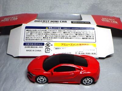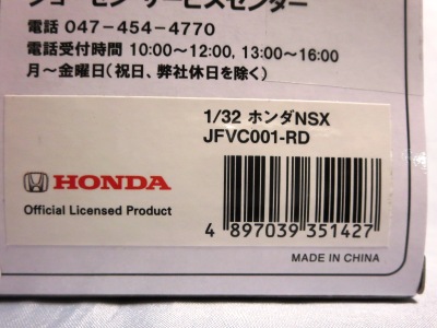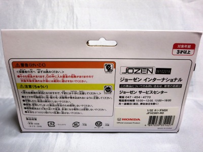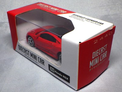 2019年2月25日に、いつもお世話になっている神奈川のコレクターの方から家電量販店のコジマでの発見情報を得て初めて存在を確認。 カプセル玩具のNSXの裏板の白文字タンポ(「MADE IN CHINA」の刻印の下に「H149834」の文字)がない。 地元にコジマの店舗がなく、多くのミニカーを扱っているコジマヤフー店にも商品がなかったので困っていたらAmazonで発見 (Amazonでの取り扱い開始日は2019年1月16日なので、このあたりが発売日か)。 コジマ価格は1,036円、Amazon価格は1,031円。開封しなかったので、ミニカーの画像はコレクターの方から頂いたもの。 2024年6月21日に、ホンダ公式ウェア&グッズオンラインショップに他のジョーゼン製のミニカーやラジコンと共にラインナップされた。 |