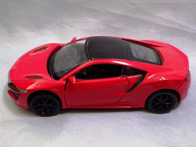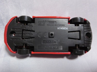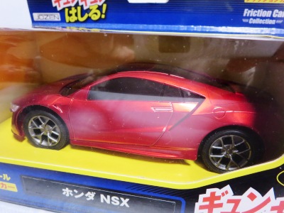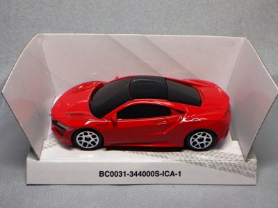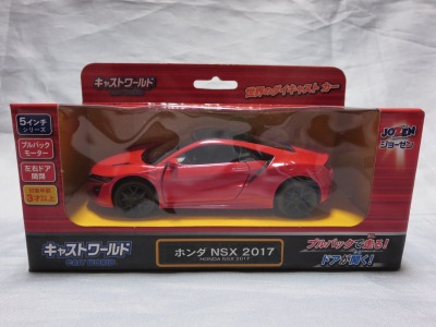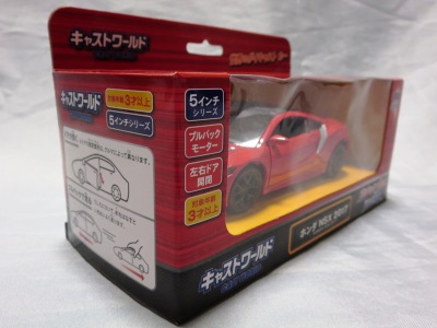 2019年8月27日にお世話になっている神奈川のコレクターK氏からの発見情報をご紹介したジョーゼン1/32「フリクションカー・ホンダNSX」を、2019年11月5日に入手。 K氏がヤマダ電機で税別896円で販売されていた同商品を代理購入してくださった。 同じジョーゼンから発売されているRMZ City製の1/32キャストワールドとパッケージやサイズなど雰囲気は似ているが、あちらはダイキャスト製でドアの開閉機構などがある。 こちらは同じプルバックカーだが、ボディはASB(アクリロニトリル・ブタジエン・スチレン)樹脂というプラスチック製で、ドアの開閉機構がないのみならず、ドアミラーまでもが省略されている。決してチープなわけではなく、開閉機構を設けなかった分ボディラインは美しく、イメージカラーのバレンシアレッドパールを再現したボディはキレイ。 |