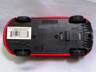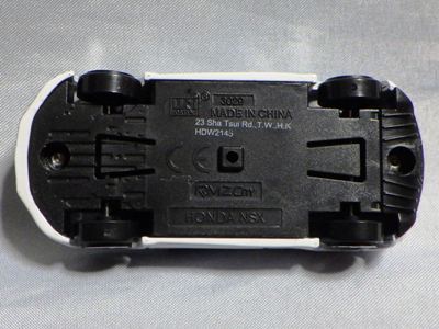 2018年10月28日にヤフオク初登場の現地箱入り新型ホンダNSX2色セットは落札できず。 2019年3月13日にレッドのみがカプセル入り商品と同価格の300円で出品され17日に落札。 販売元の現地仕様が個人輸入で日本に出回っているものだと思っていたのだが、実は日本語シールの貼られた正規輸入品で、アミューズメント施設のクレーンゲームの商品として日本国内で普通に流通しているということが判明。 裏板の白文字タンポの番号は、「H155437」となっており、カプセル玩具バージョンとは異なる。箱側面の番号も同じ。 |