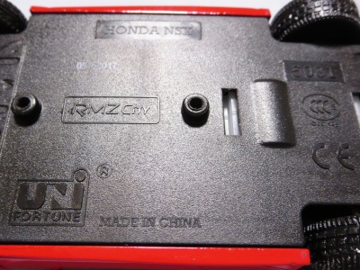 レッドモデルも一緒に出品されていたが、ジョーゼンのモデルがホンダ仕様であったことを忘れ、落札し損ねた。すべて箱なし。 ブラックモデルのみメッキホイールで、あとはブラックホイール。 全長125mm・重量119gで、スケールは1/36くらい。 |