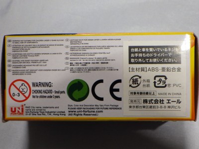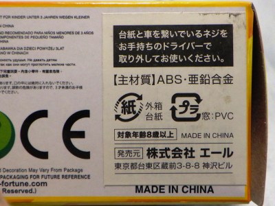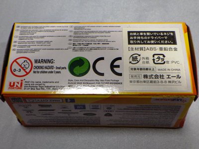 2021年10月23日にヤフオクに出品されたものを落札して入手した(商品名には1/32とあったが明らかに間違い)。 2019年に入手したものとはパッケージデザインが異なり、日本語シールにプリントされた発売元の会社名も「株式会社ハック」から「株式会社エール」に変更されている。 ヤフオクには新旧パッケージが入り交じった状態で多くの車種が出品されているが、旧パッケージの方が多いように見えるので、パッケージが変更になったのは最近なのかもしない。 商品自体はアミューズメント施設の景品か。単品で販売されているような感じではないが、トイザらスには置いてありそう。 箱側面の番号は、「HDW2115」。パッケージ内のミニカーは紙の台座にネジで固定されているため裏板の番号は未確認。 |