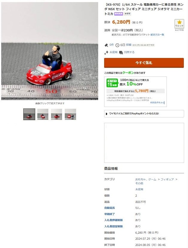 ANEKA BONEKA(アネカボネカ) 2024年7月29日に、ヤフオクに1/64「ホンダNSX電動乗用カー&フィギュアセット」を出品されて、その存在を初めて知った埼玉の方です。 この方が海外に在住していた時に縁があって知り合った、ケポピックというクリエイターの方が制作された1/64のフィギュアや小物類を、独自のブランドでヤフオクに多数出品されています。 普通のディオラマに使えそうなものだけではなく、「電人ザボーガーと大門豊セット」「ゴーストバスターズ4人セット」「ゴーストライダーとバイクセット」「ビートルズ4人セット」「スキンヘッドのプロレスラー」「魔人ブゥ」「桜木花道」といったマニアックなフィギュアが多数出品されており、見ているだけで楽しくなります。 |